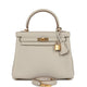 This Kelly, in the Retourne style, is in Beton togo leather with gold hardware has tonal stitching, front flap, two straps with center toggle closure, clochette with lock and two keys, single rolled handle and a removable shoulder strap.