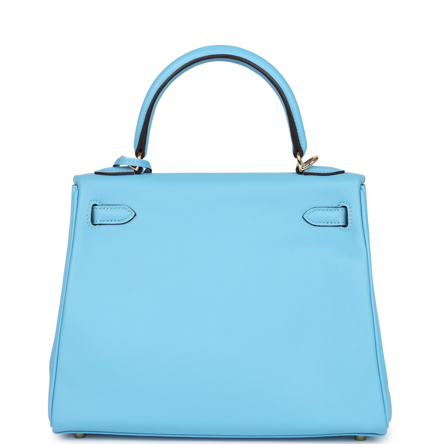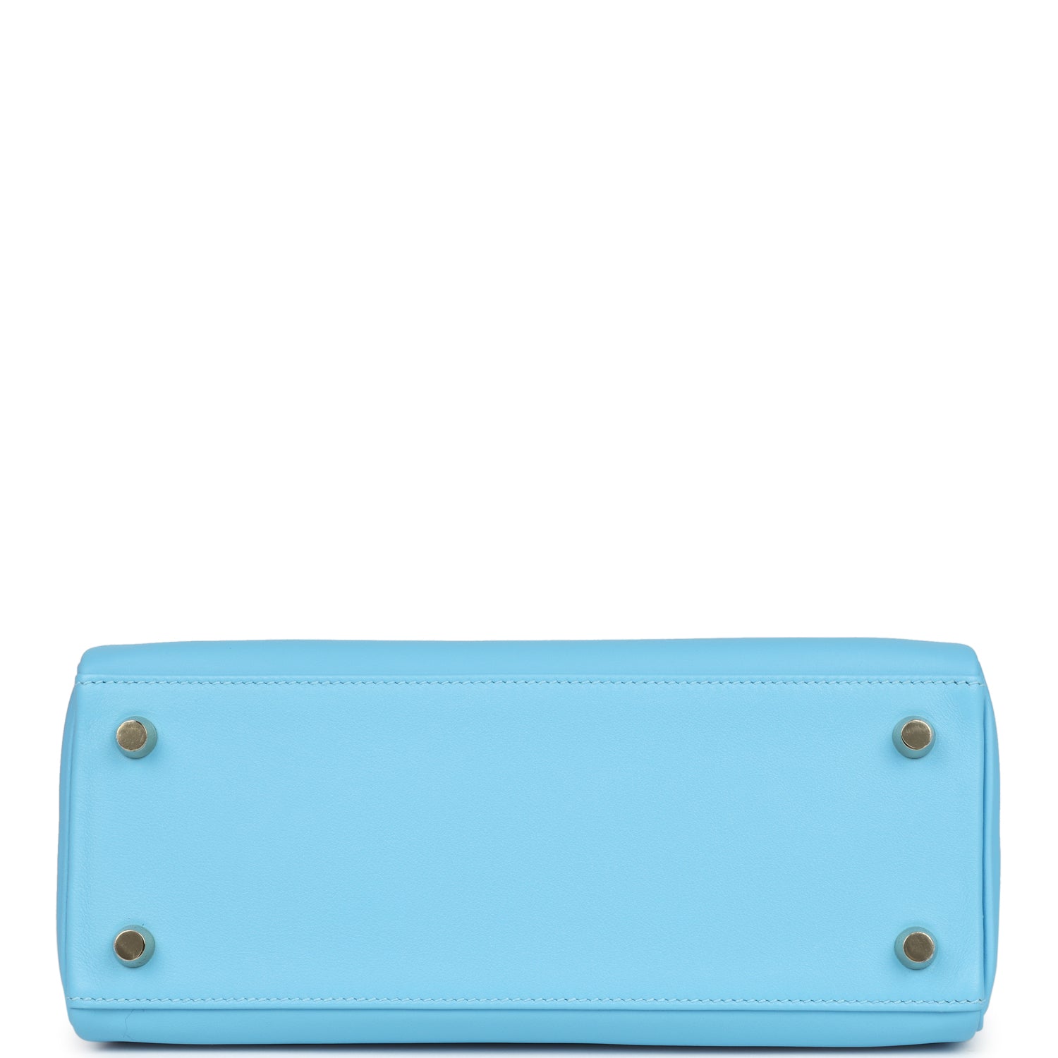 This Kelly, in the Retourne style, is in Bleu Celeste swift leather with palladium hardware and has tonal stitching, front flap, two straps with center toggle closure, clochette with lock and two keys, single rolled handle and an optional shoulder strap.