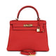 This Kelly, in the Retourne style, is in Geranium togo leather with gold hardware and has tonal stitching, front flap, two straps with center toggle closure, clochette with lock and two keys, single rolled handle and removable shoulder strap.