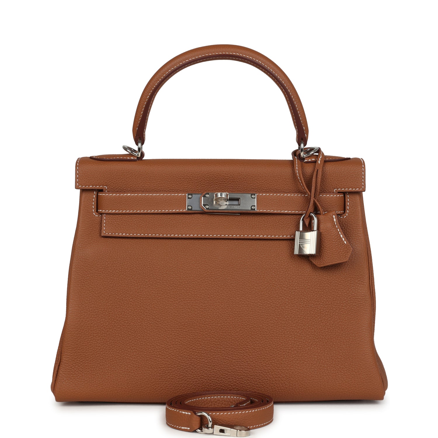 This Kelly, in the Retourne style, is in Gold togo leather with palladium hardware and has contrast stitching, front flap, two straps with center toggle closure, clochette with lock and two keys a single rolled handle and removable shoulder strap.