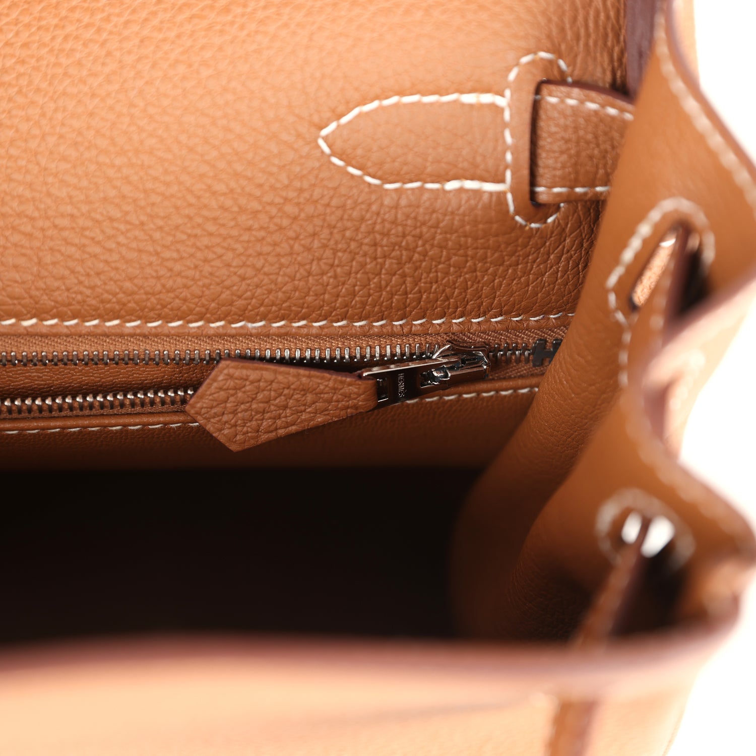 The interior is lined with Gold chevre leather and has one zip pocket with an engraved pull and two open pockets on the opposite side.