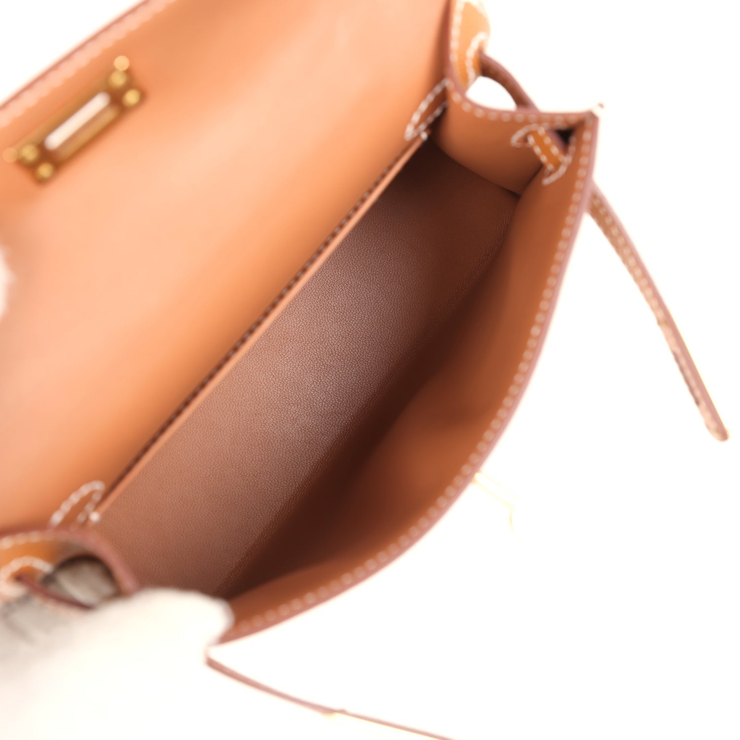 The interior is lined with Gold lambskin leather and has one open pocket on the back wall.