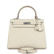 This Kelly, in the Sellier style, is in Beton ostrich with palladium hardware and has tonal stitching, two straps with front toggle closure, clochette with lock and two keys, single rolled handle and removable shoulder strap.
