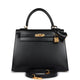 This Kelly, in the Sellier style, is of Black boxcalf leather with gold hardware and has tonal stitching, front flap, two straps with center toggle closure, clochette with lock and two keys, single rolled handle and an optional shoulder strap.