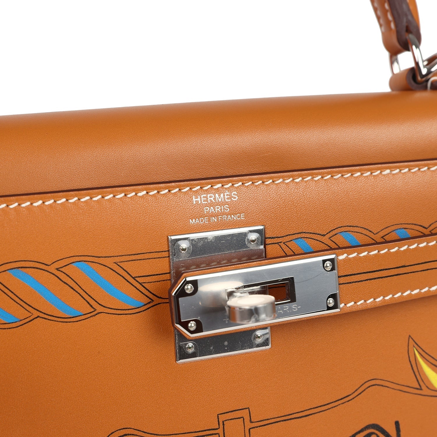 This limited edition Kelly "Painted Quadrige", in the Sellier style, is in Naturel Sable Butler leather with palladium hardware, featuring contrasting stitching, an all over hand-painted quadrige design by Pierre Perron, front flap, two straps with center toggle closure, clochette with lock and two keys a single rolled handle and a removable shoulder strap.
