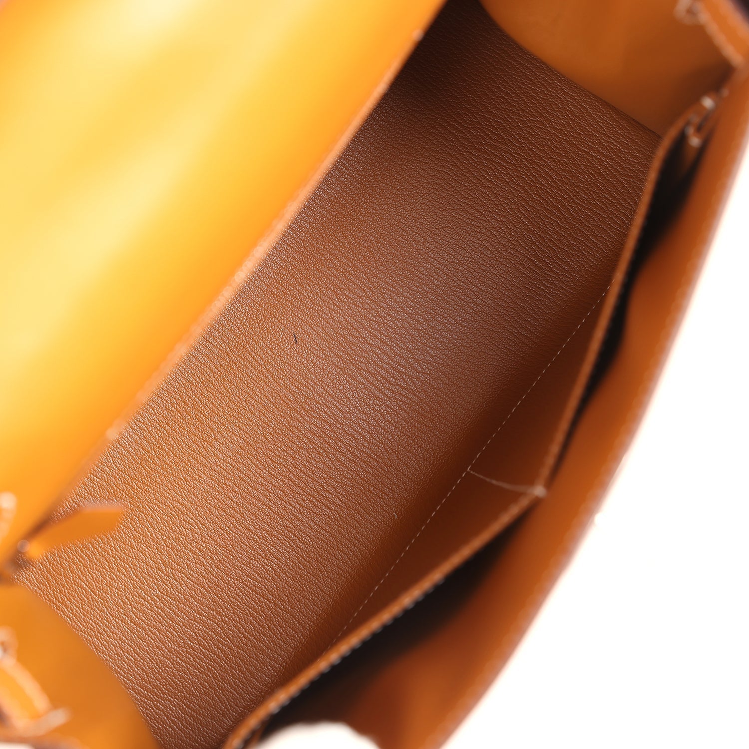 The interior is lined with Naturel Sable chevre leather and has one zip pocket with an Hermès engraved pull and two open pockets on the opposite side.
