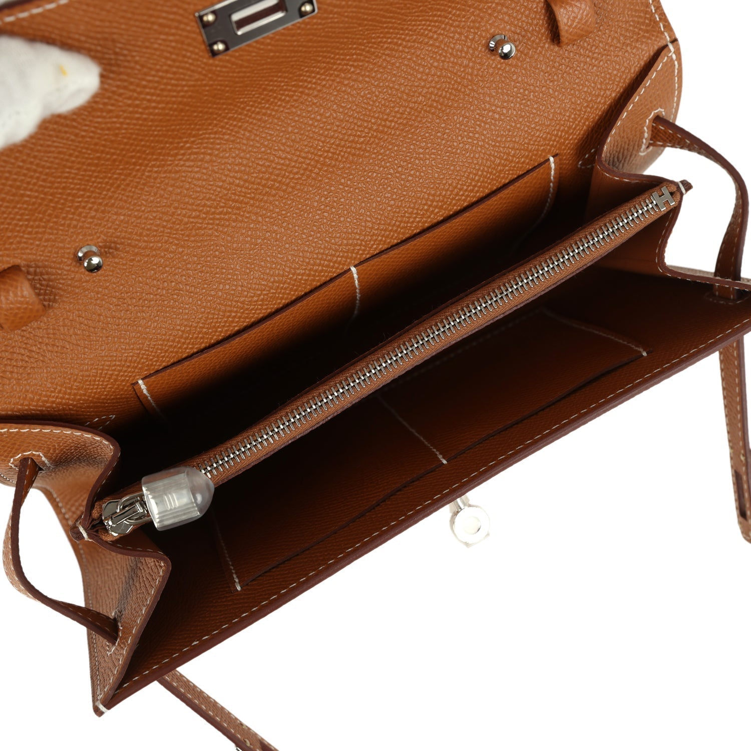 This Kelly Wallet To Go is in Gold epsom leather with palladium hardware and has contrast stitching, two straps with front toggle closure and removable crossbody strap.