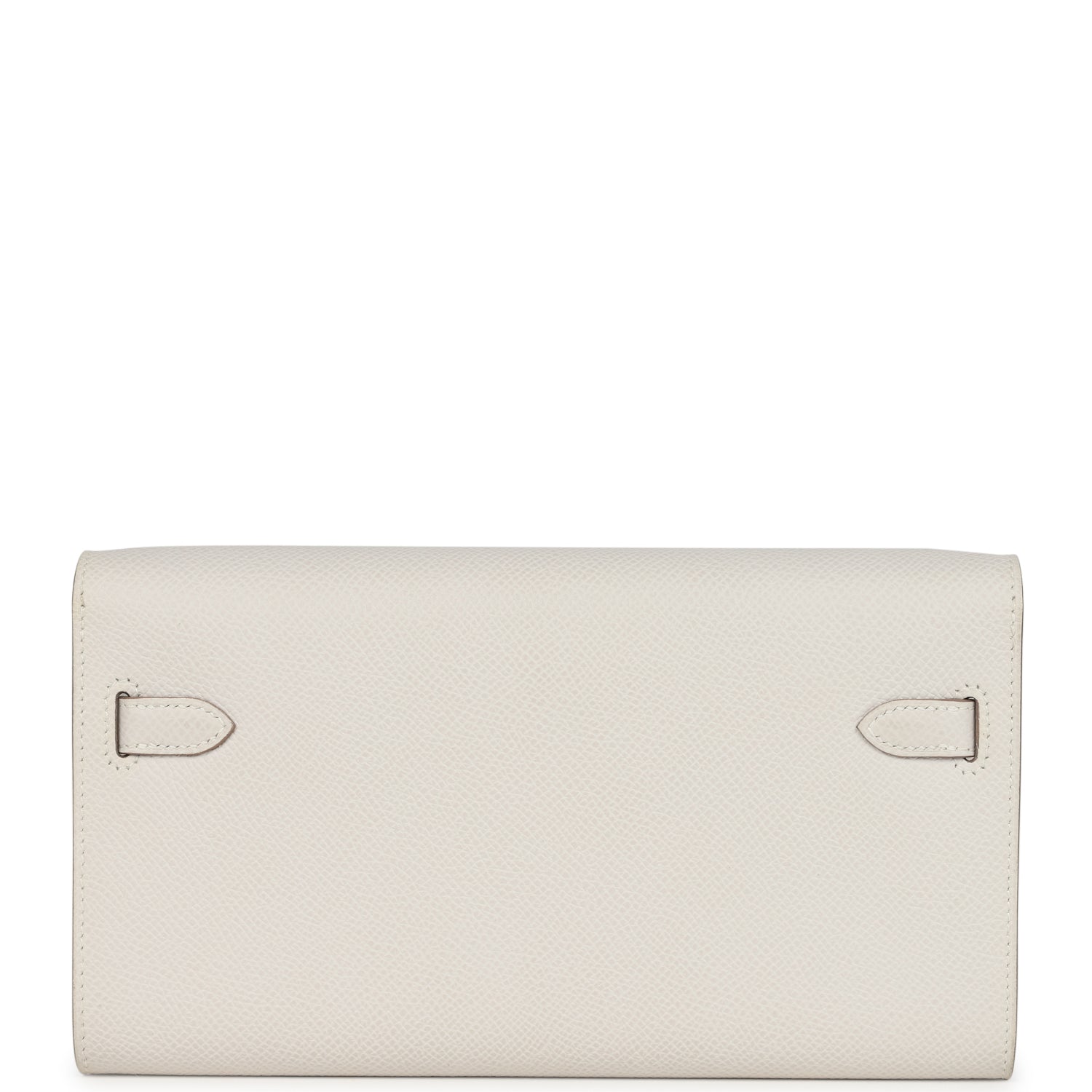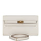 This Kelly Wallet To Go is in Gris Pale epsom leather with gold hardware and has tonal stitching, two straps with front toggle closure and removable crossbody strap.