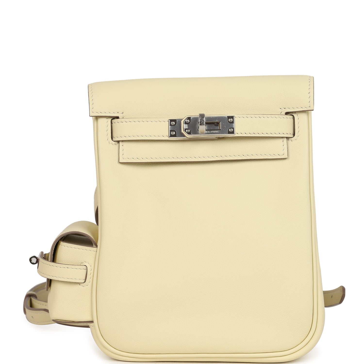 This Mini Kelly Jump Backpack is in Jaune Milton swift leather with palladium hardware, featuring tonal stitching, a mini exterior pouch on side of backpack, pull straps that attach to a toggle closure, and has adjustable flat leather backpack straps.