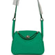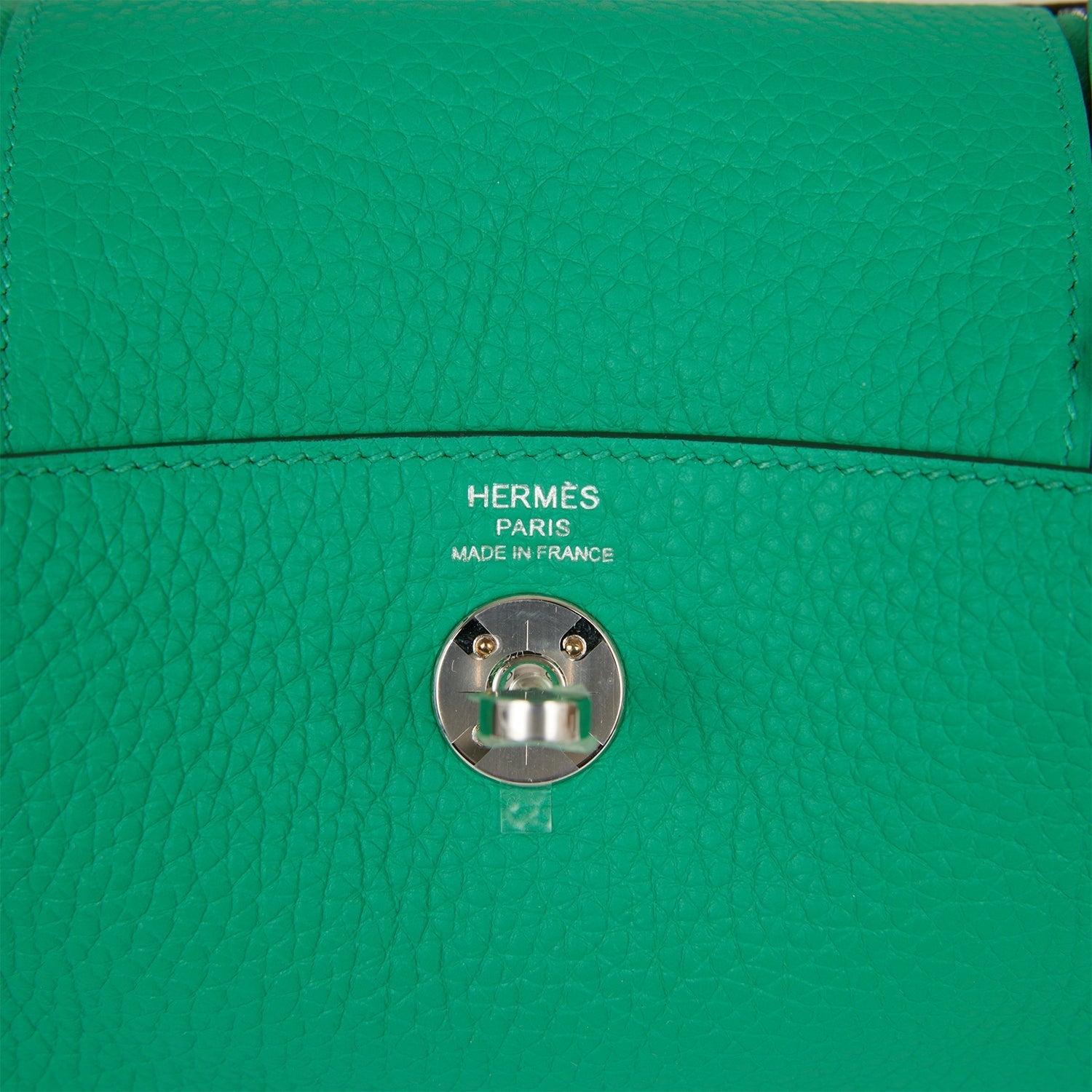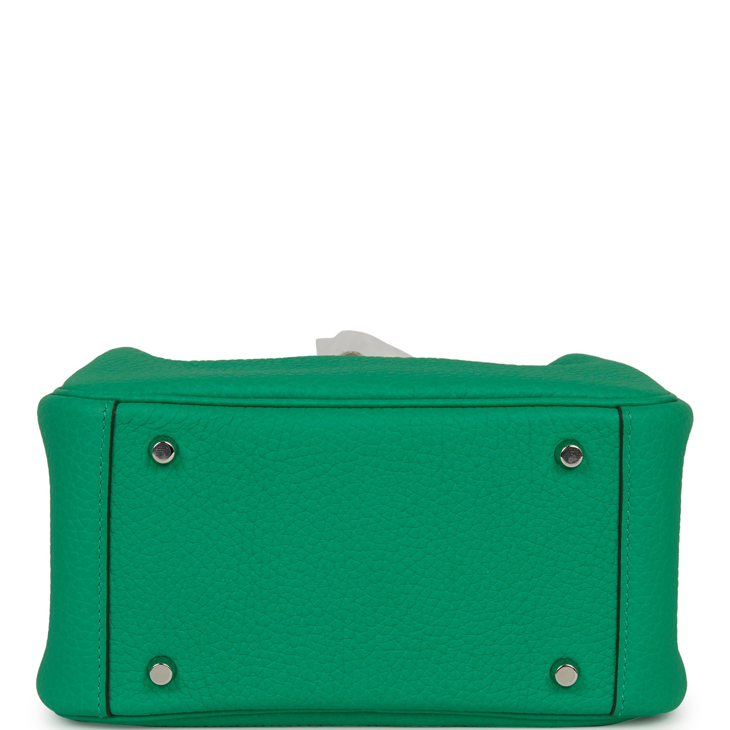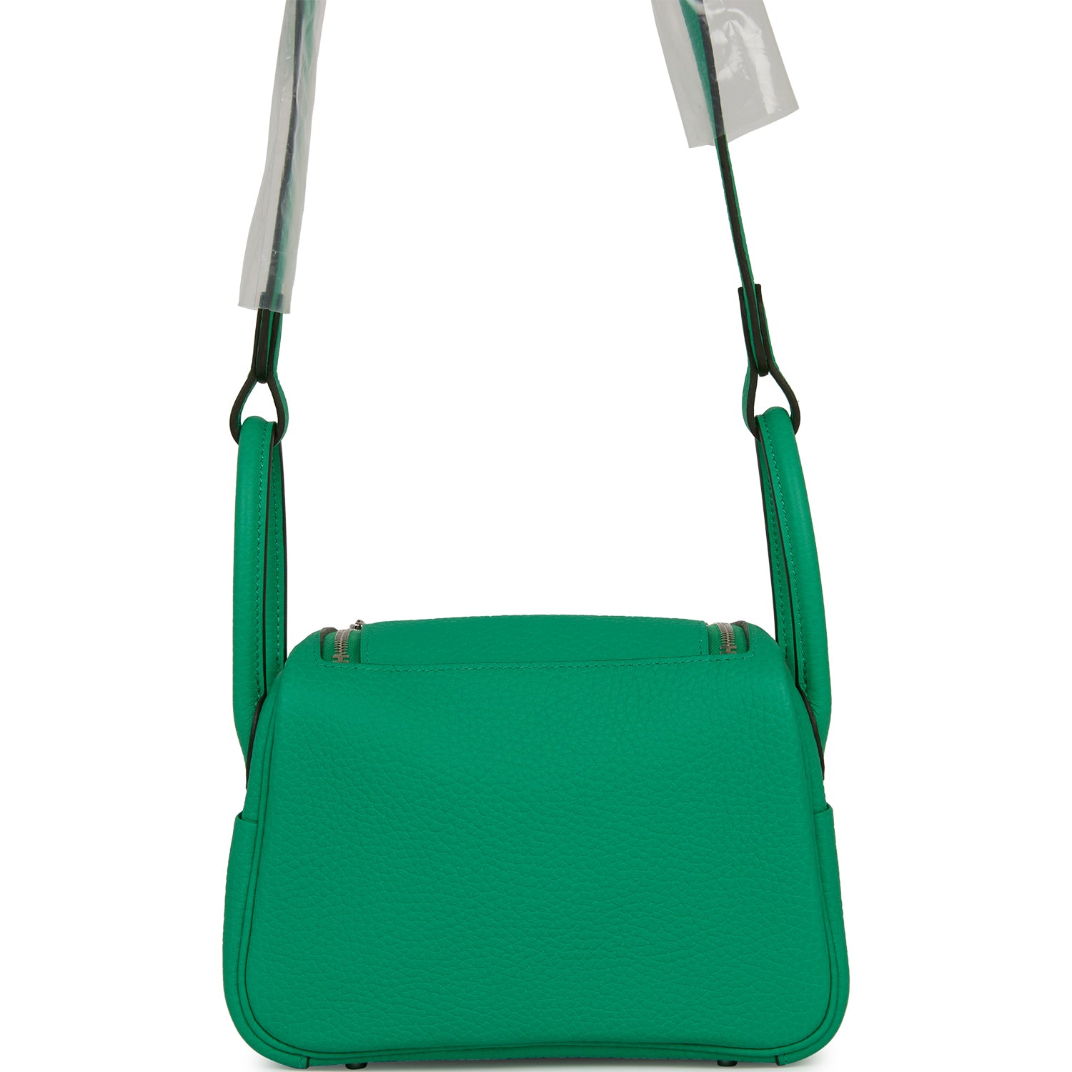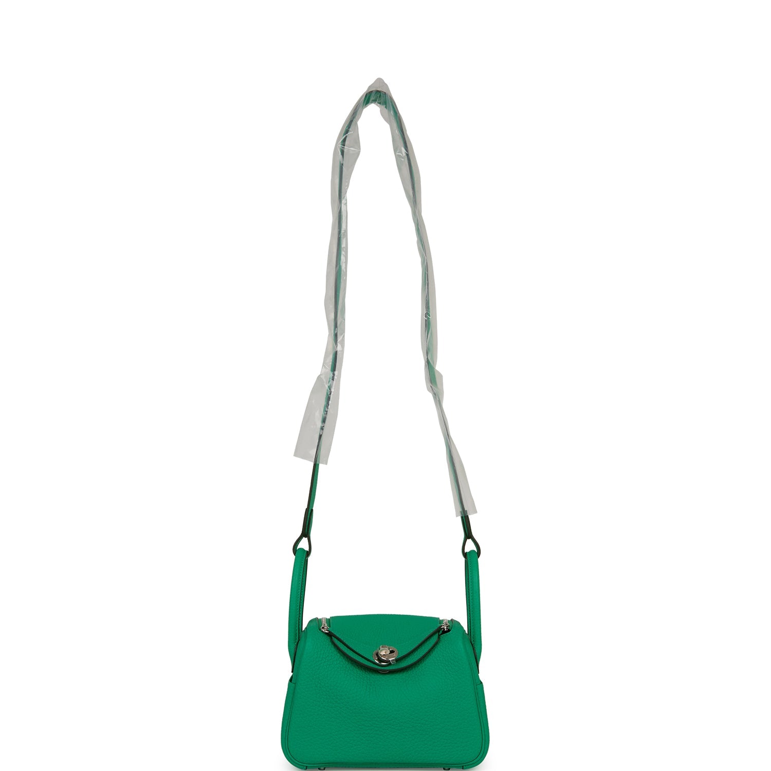 This Mini Lindy is in Menthe clemence leather with palladium hardware and has tonal stitching, double zipper pulls, front Hermès twist lock, single pocket on each side, two rolled top handles linked by a flat shoulder strap.
