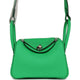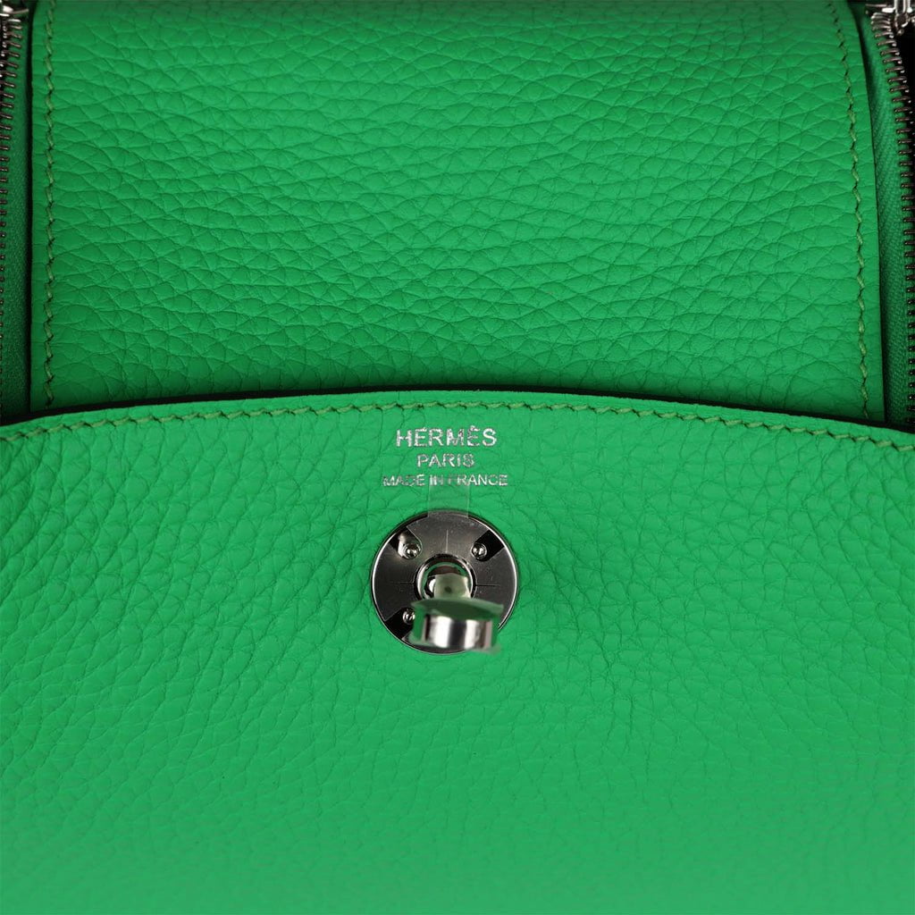 This Mini Lindy is in Vert Comics clemence leather with palladium hardware and has tonal stitching, double zipper pulls, front Hermès twist lock, single pocket on each side, two rolled top handles linked by a flat shoulder strap.