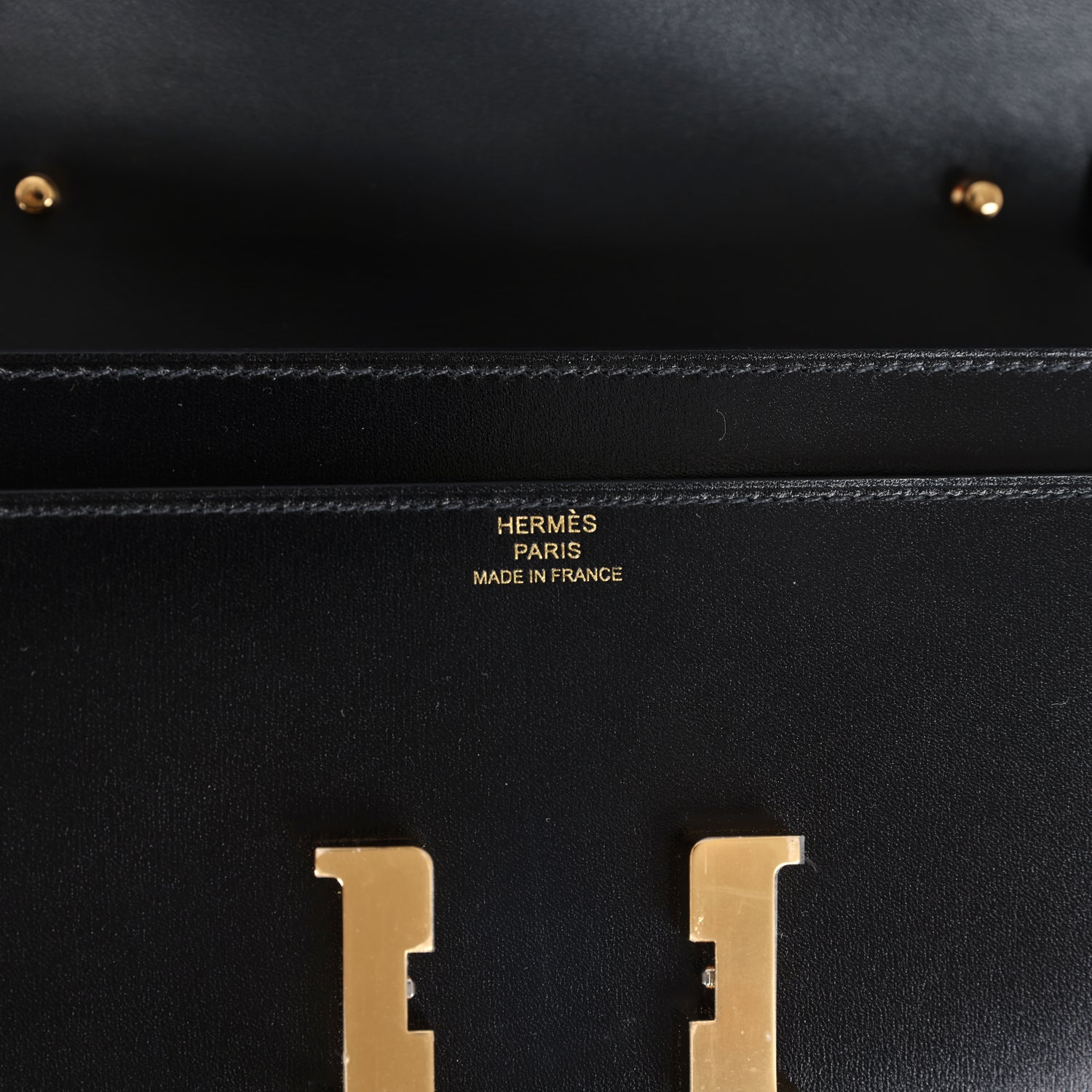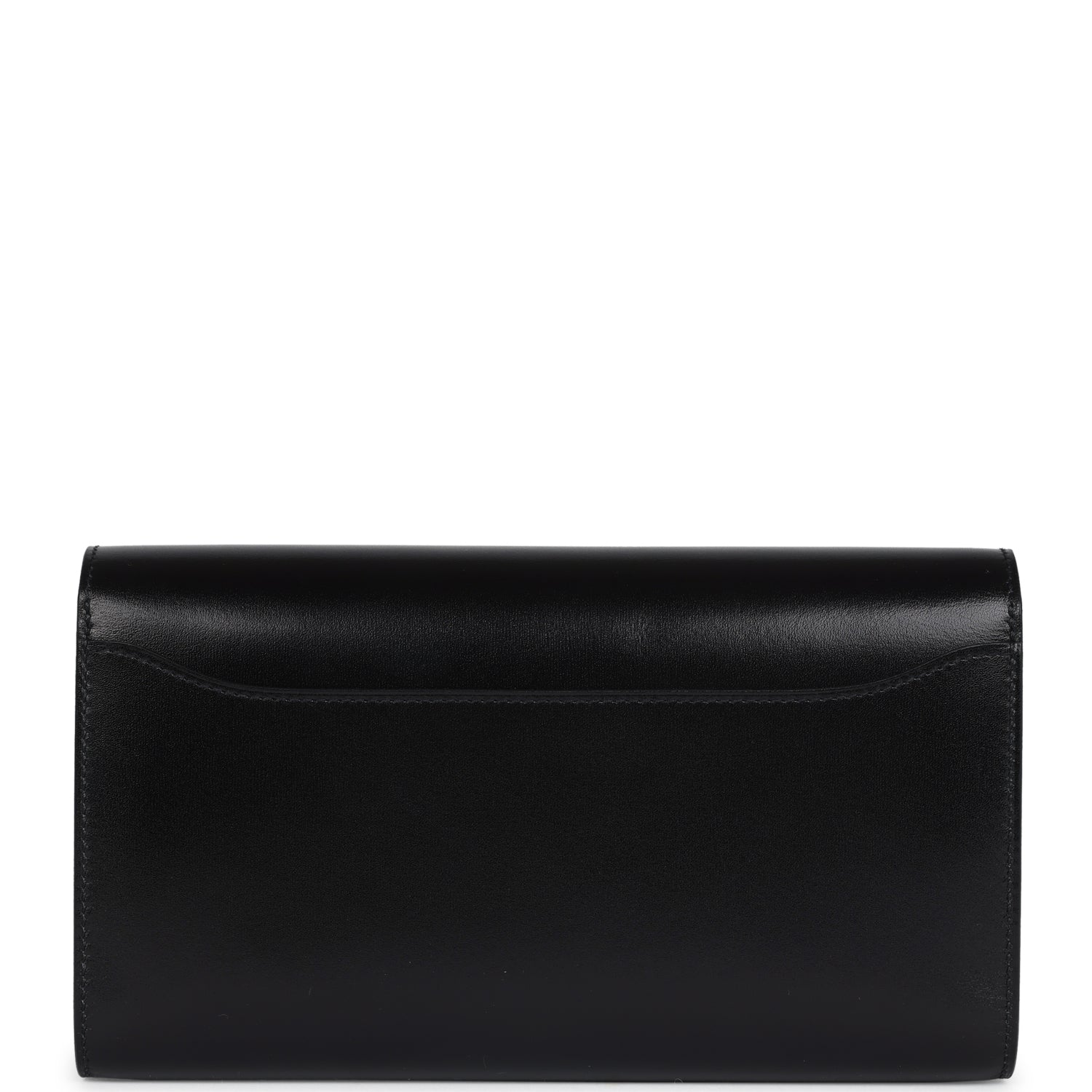 This Rock Constance Wallet To Go is in Black box calfskin leather with gold hardware and has tonal stitching, metal "H" snap lock closure, open front compartment and two removable straps; one long crossbody strap and one "Rock" shoulder strap with gold studs.