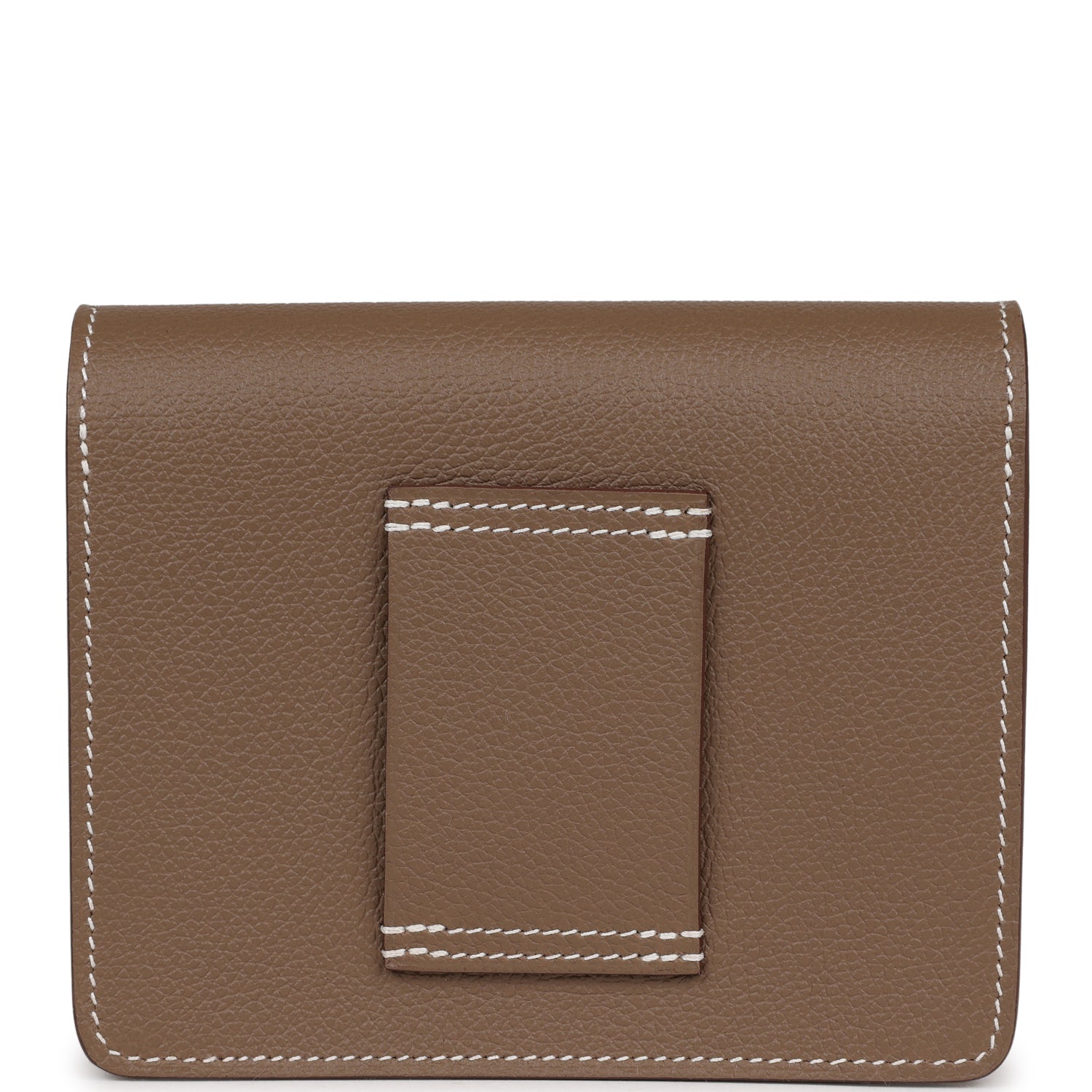 This Roulis Slim Wallet is in Etoupe evercolor with gold hardware, two interior credit card slots, removable zipper coin purse, front palladium plated H clasp, and a belt loop on back exterior.