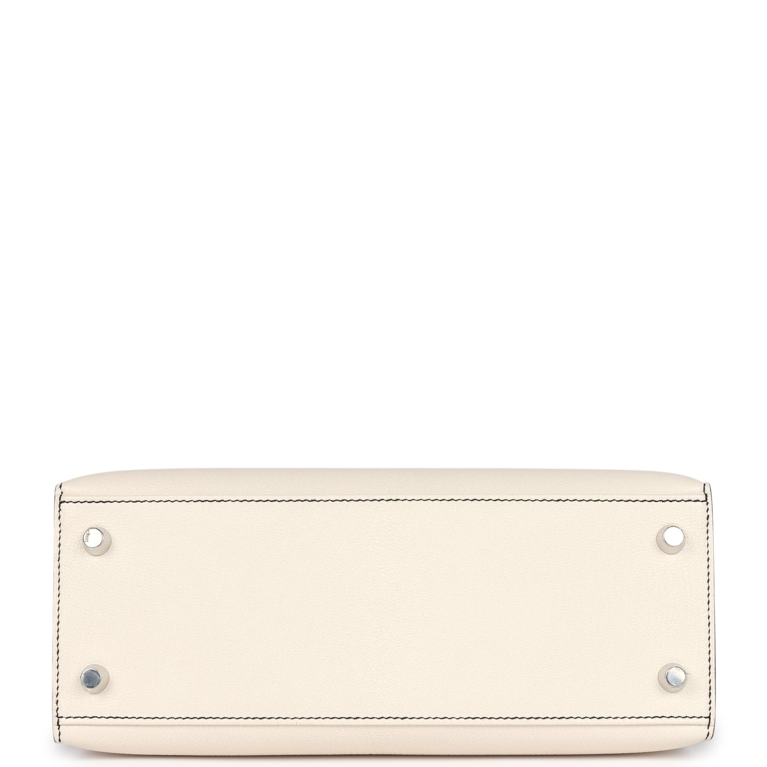 This Special Order Kelly, in the Sellier style, is in Nata and Black chevre mysore leather with brushed palladium hardware and has contrast stitching, two straps with front toggle closure, clochette with a clover symbol, with lock and two keys, single rolled handle and removable shoulder strap.