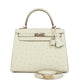 This Special Order Kelly, in the Sellier style, is in Nata ostrich with permabrass hardware and has tonal stitching, two straps with front toggle closure, clochette with lock and two keys, single rolled handle and removable shoulder strap.