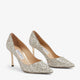 An alluring pair created with an impactful design, these Romy 85 pumps by Jimmy Choo boast a coarse glitter fabric upper, pointed-toe silhouette and striking stiletto heel.