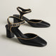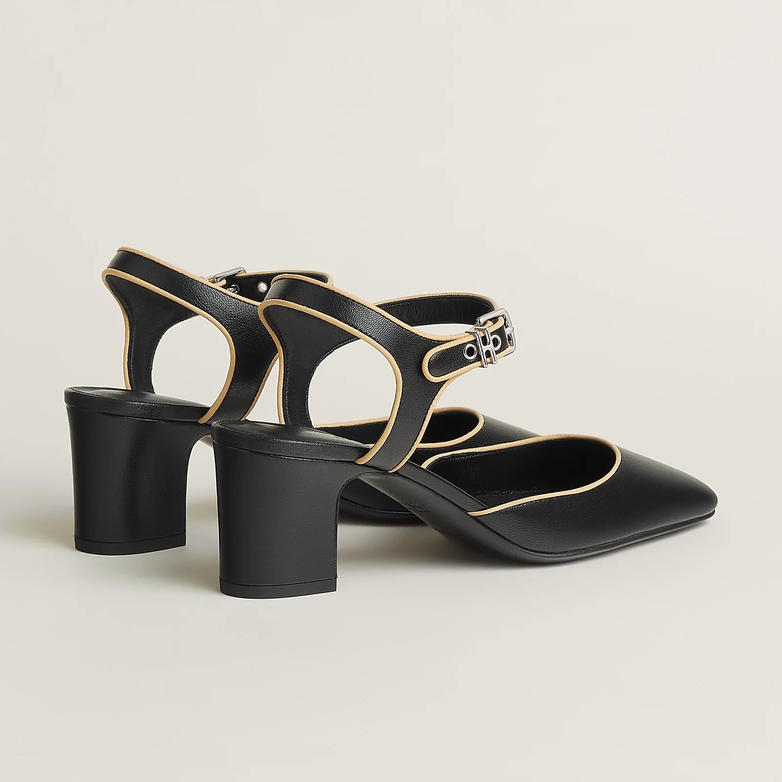 High heel Mary Jane shoe in goatskin and Nappa leather with signature "H" buckle and contrasting piping.