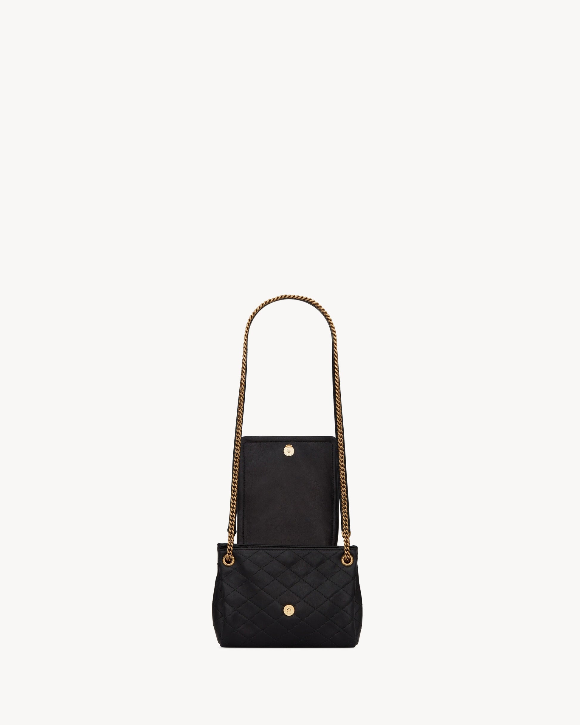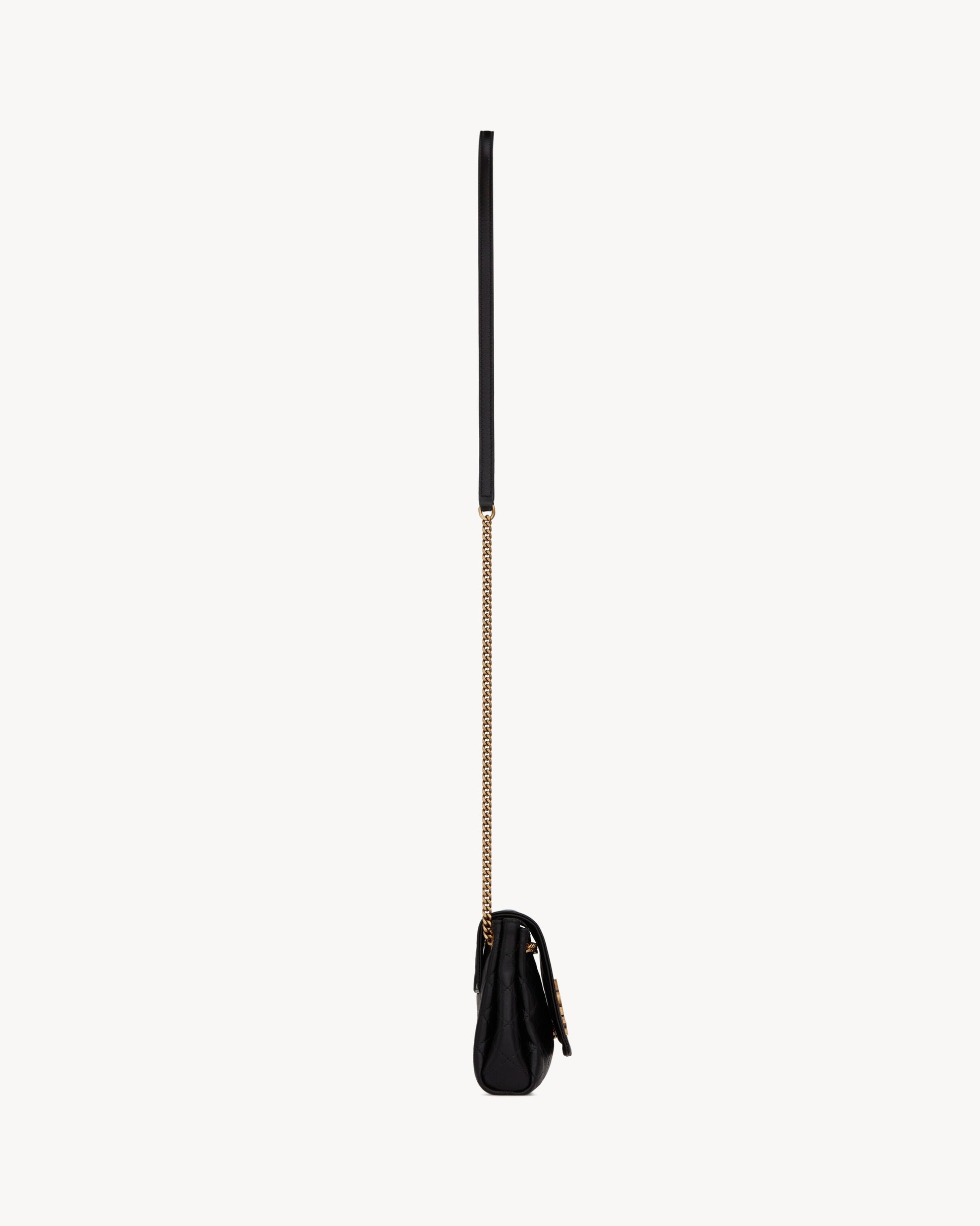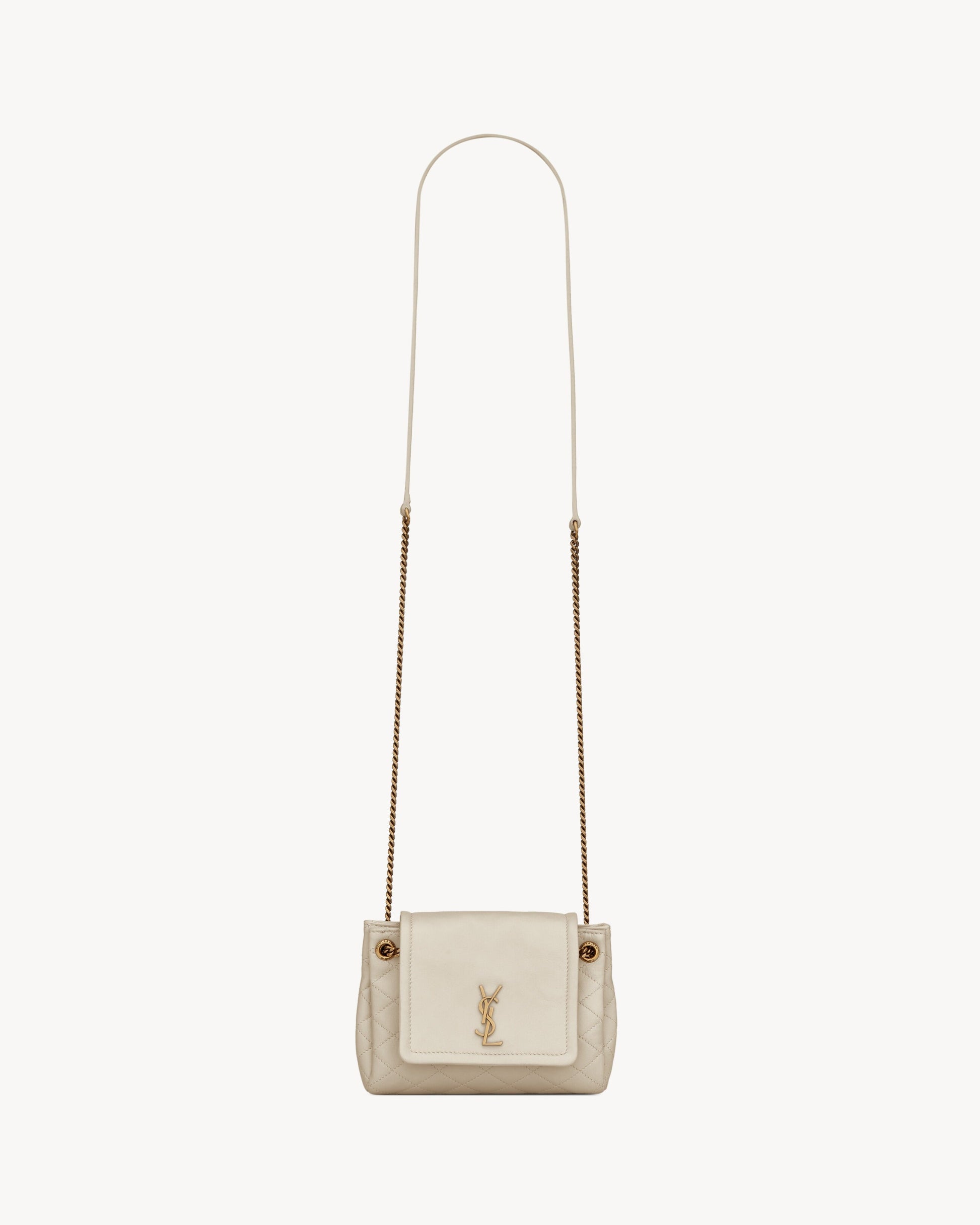 Mini bag with front flap, casandre embellishment and quilted topstitching.