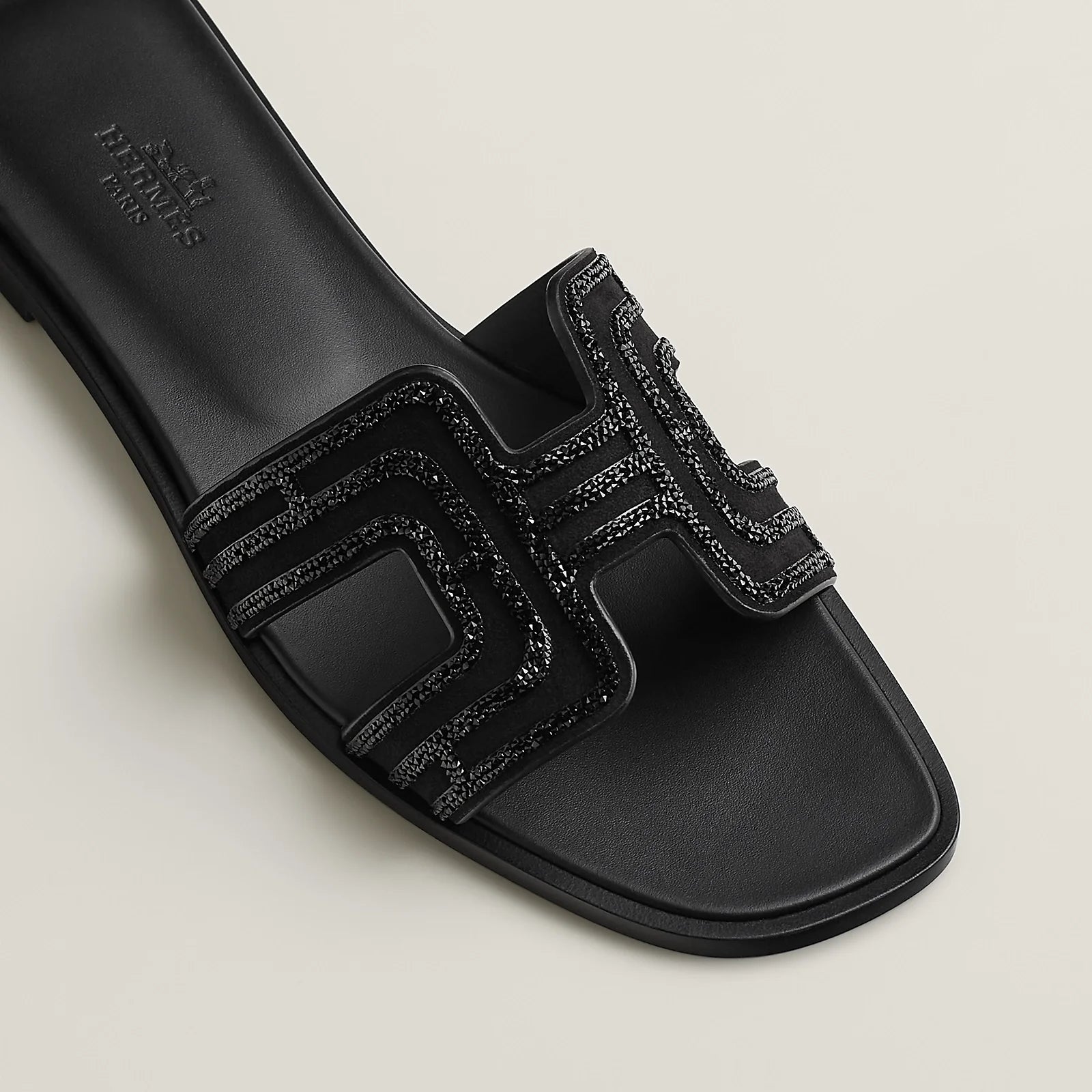 Sandal in suede goatskin with iconic "H" cut-out and "Arcane" rhinestone motif.