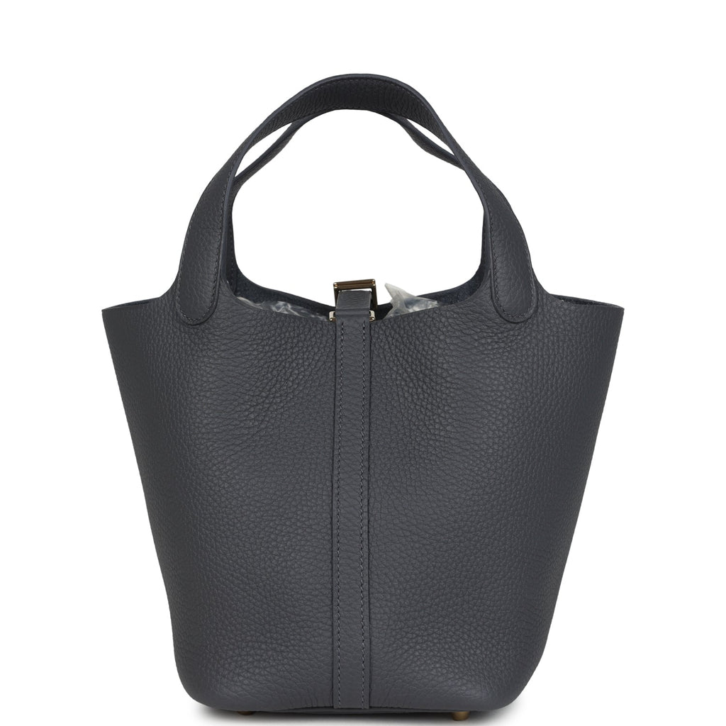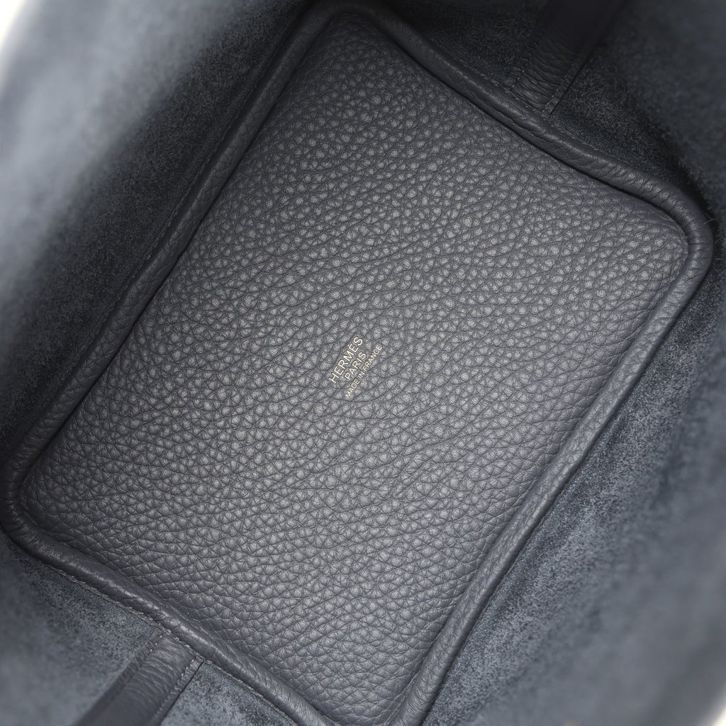 This Picotin is in Ardoise clemence leather with permabrass hardware and has tonal stitching with two top handles, lock and two keys.