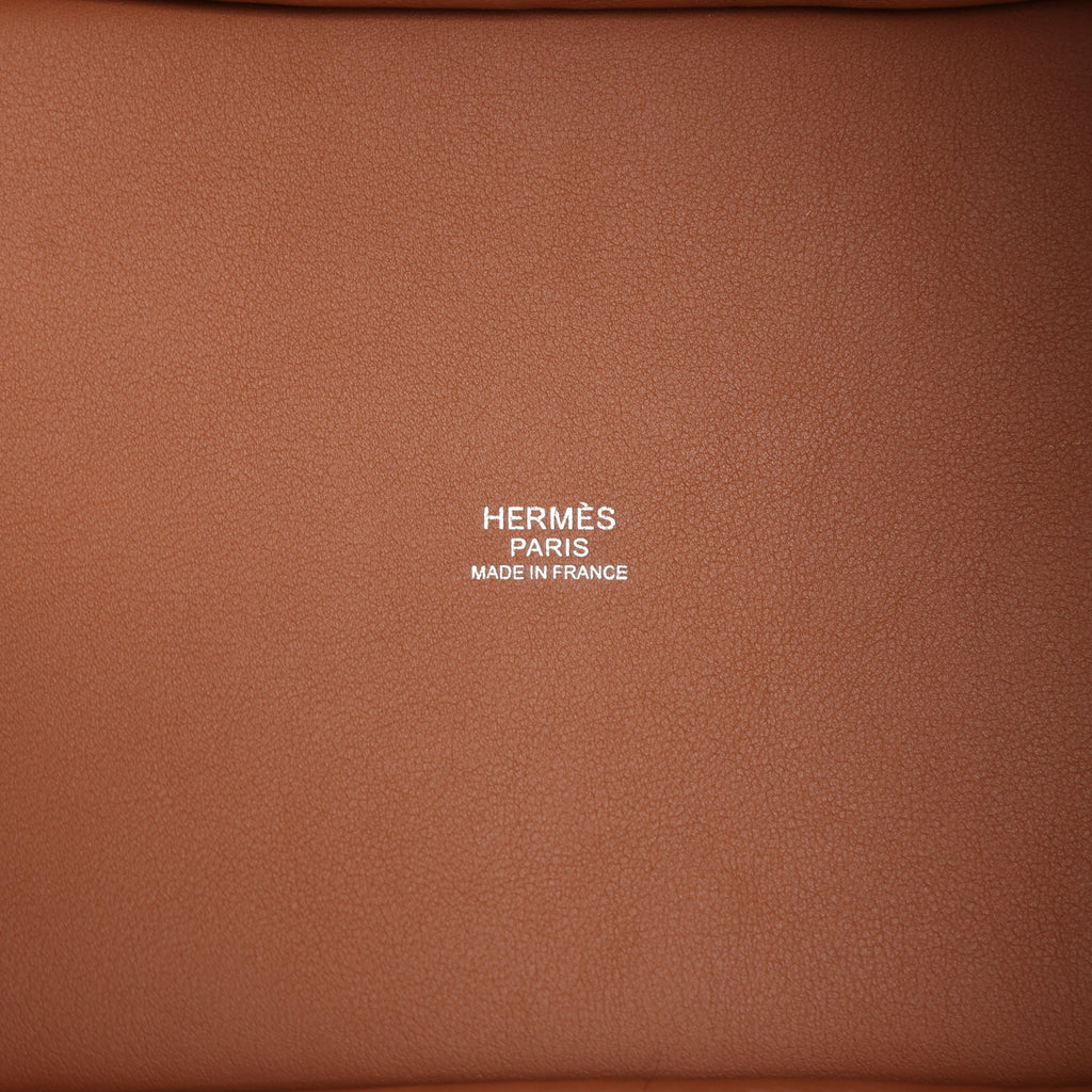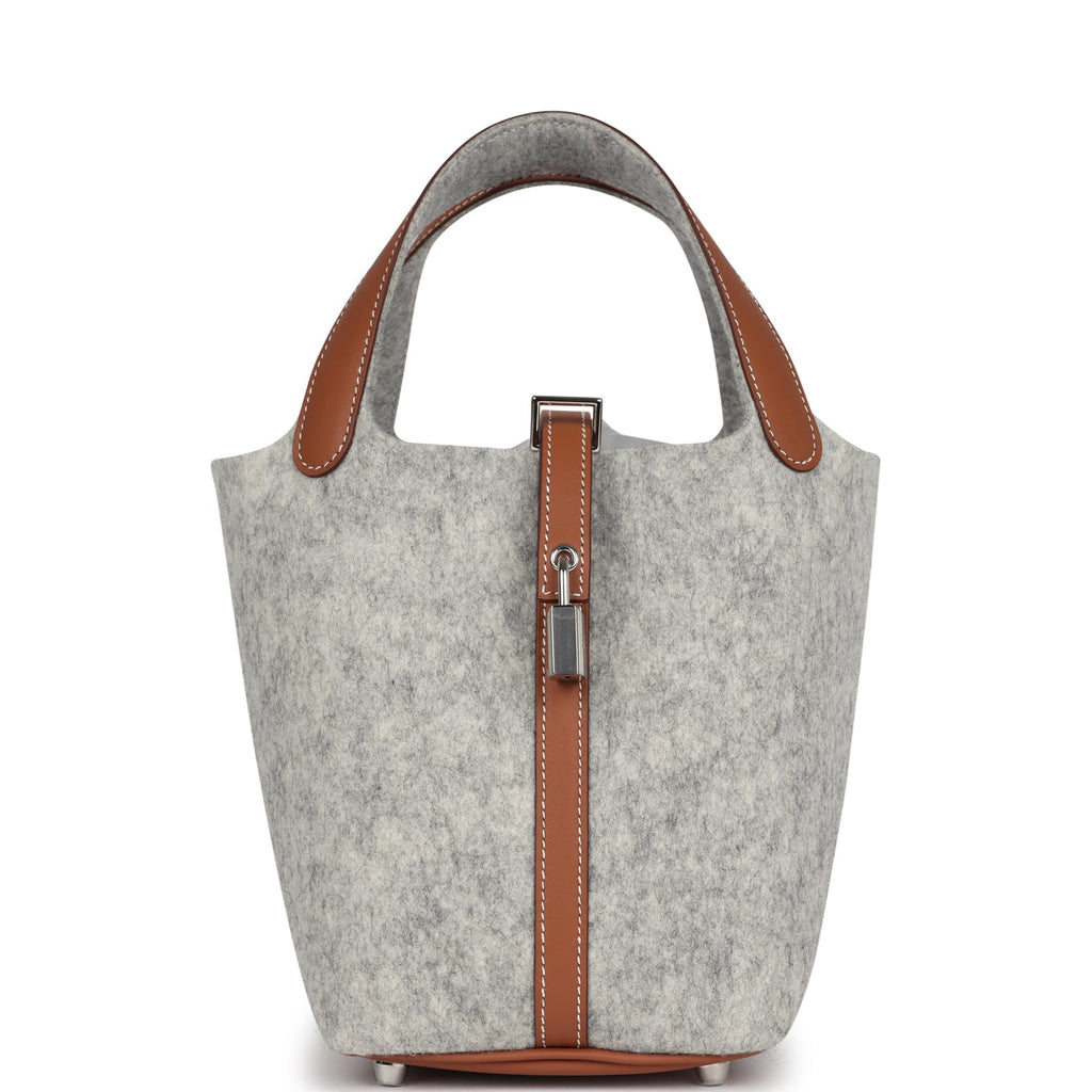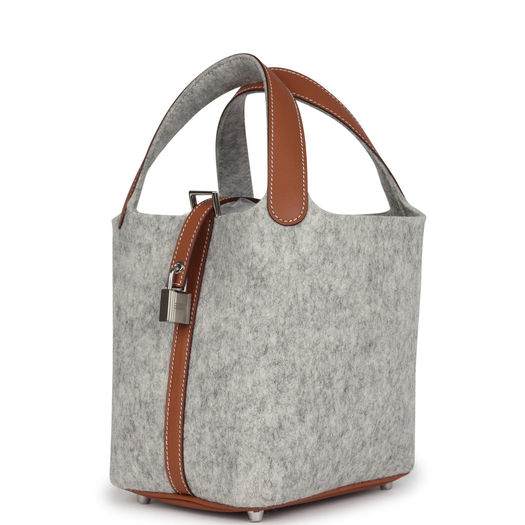 This Picotin Lock is in Gris Clair Feutre felt and Gold swift leather with palladium hardware and has contrast stitching with two top handles, lock and two keys.