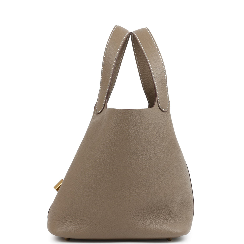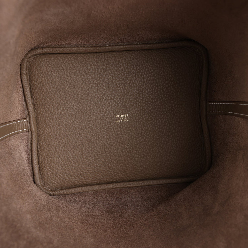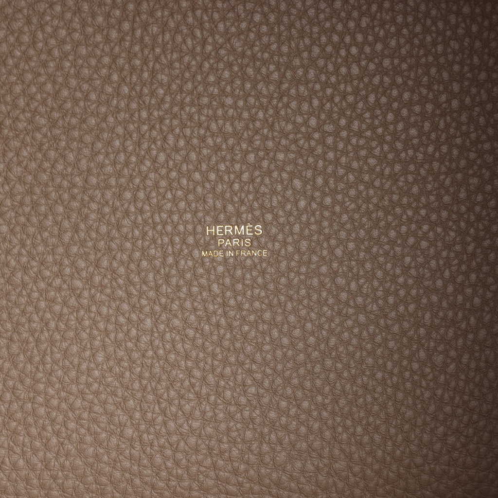 This Picotin is in Etoupe clemence leather with gold hardware and has white contrast stitching with two top handles.
