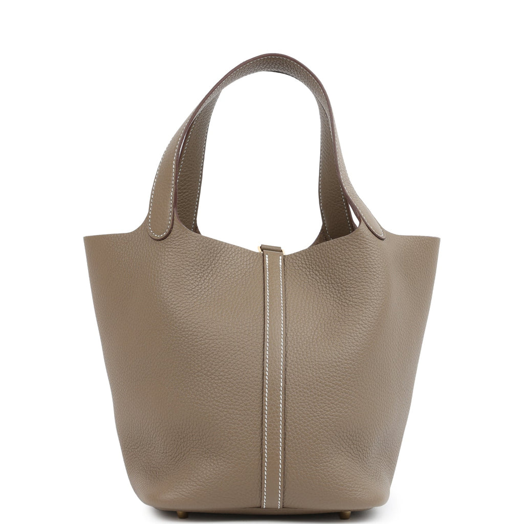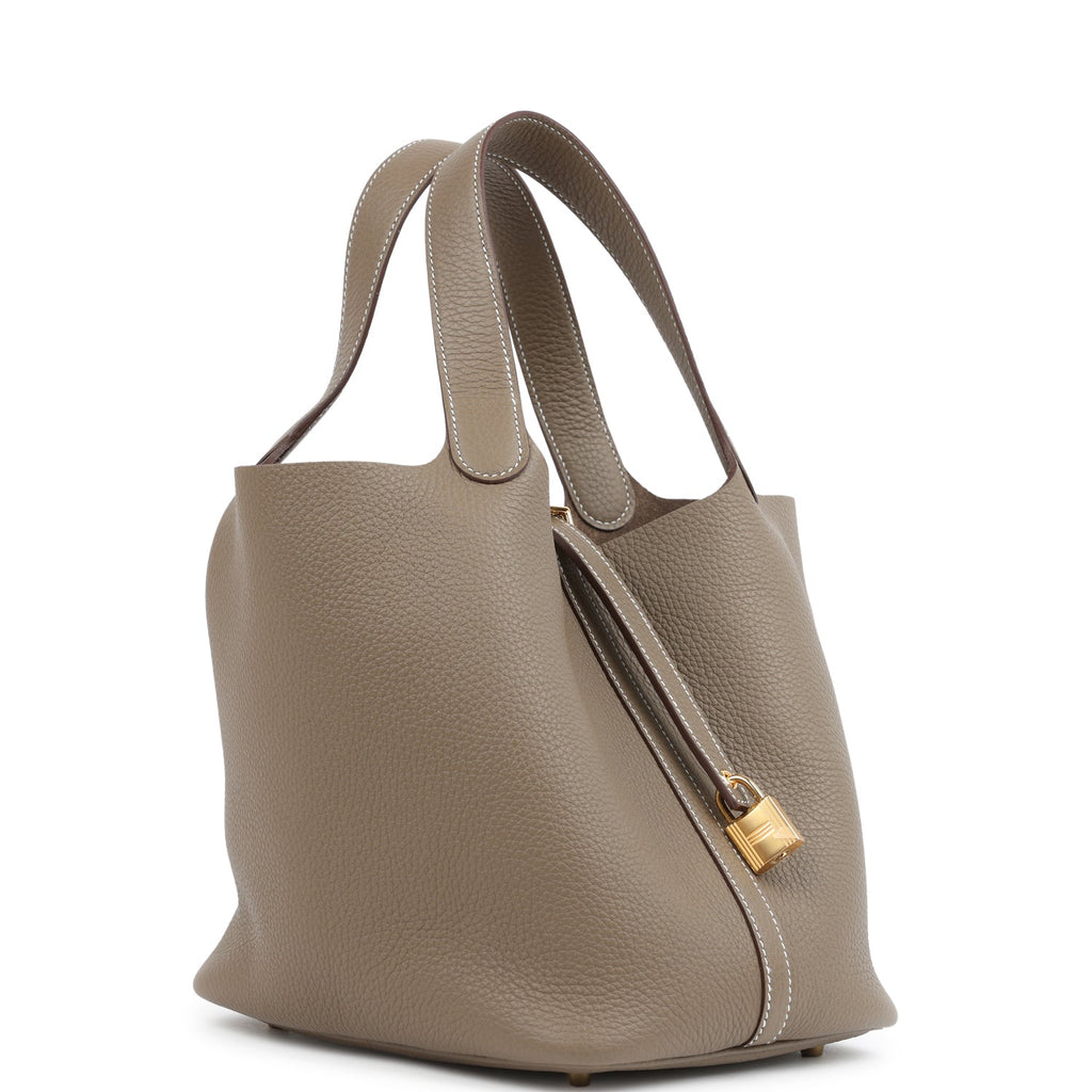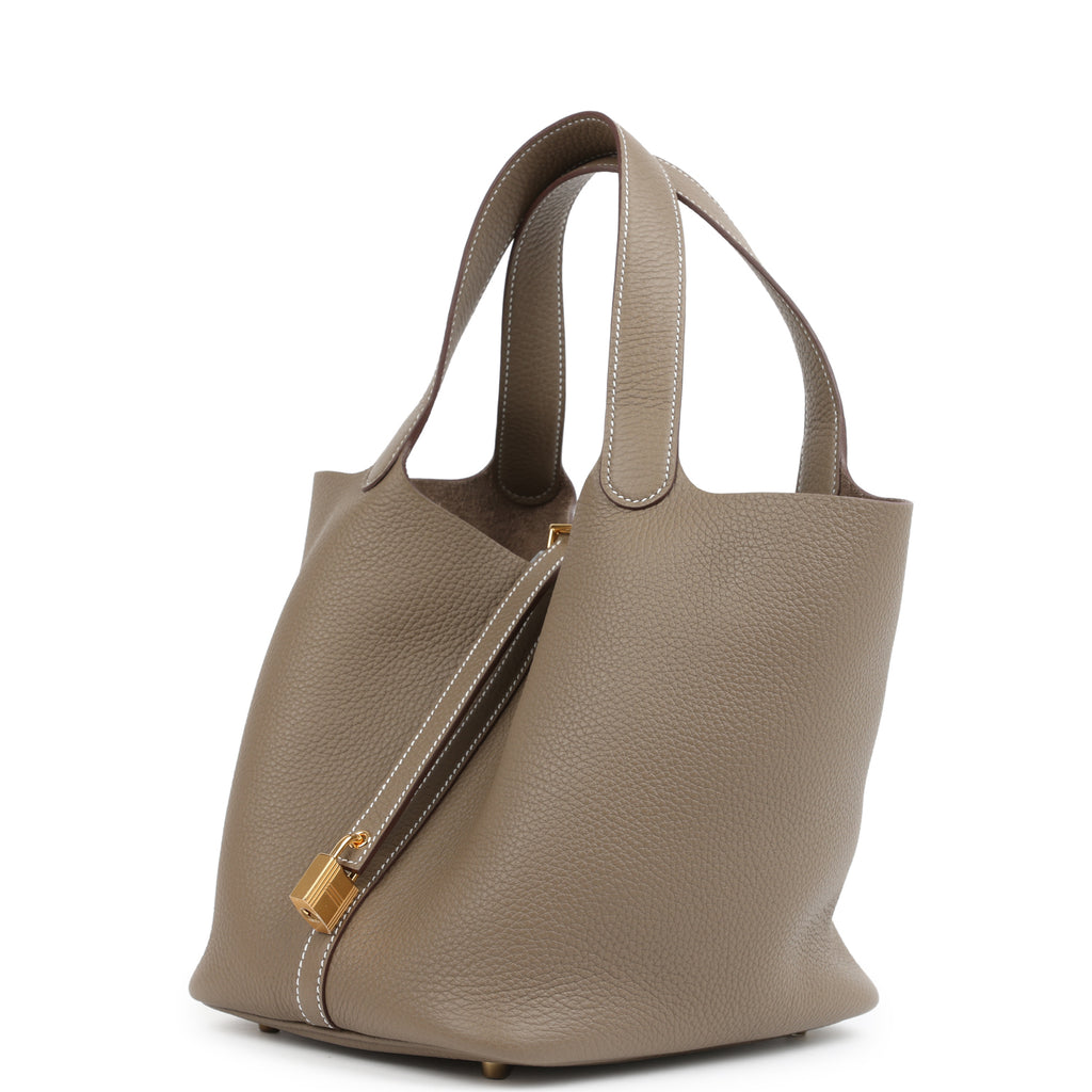 This Picotin is in Etoupe clemence leather with gold hardware and has white contrast stitching with two top handles.