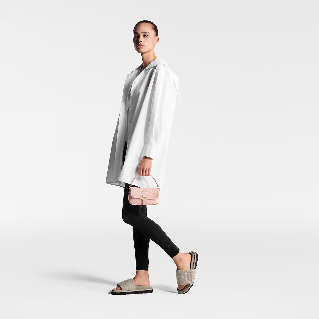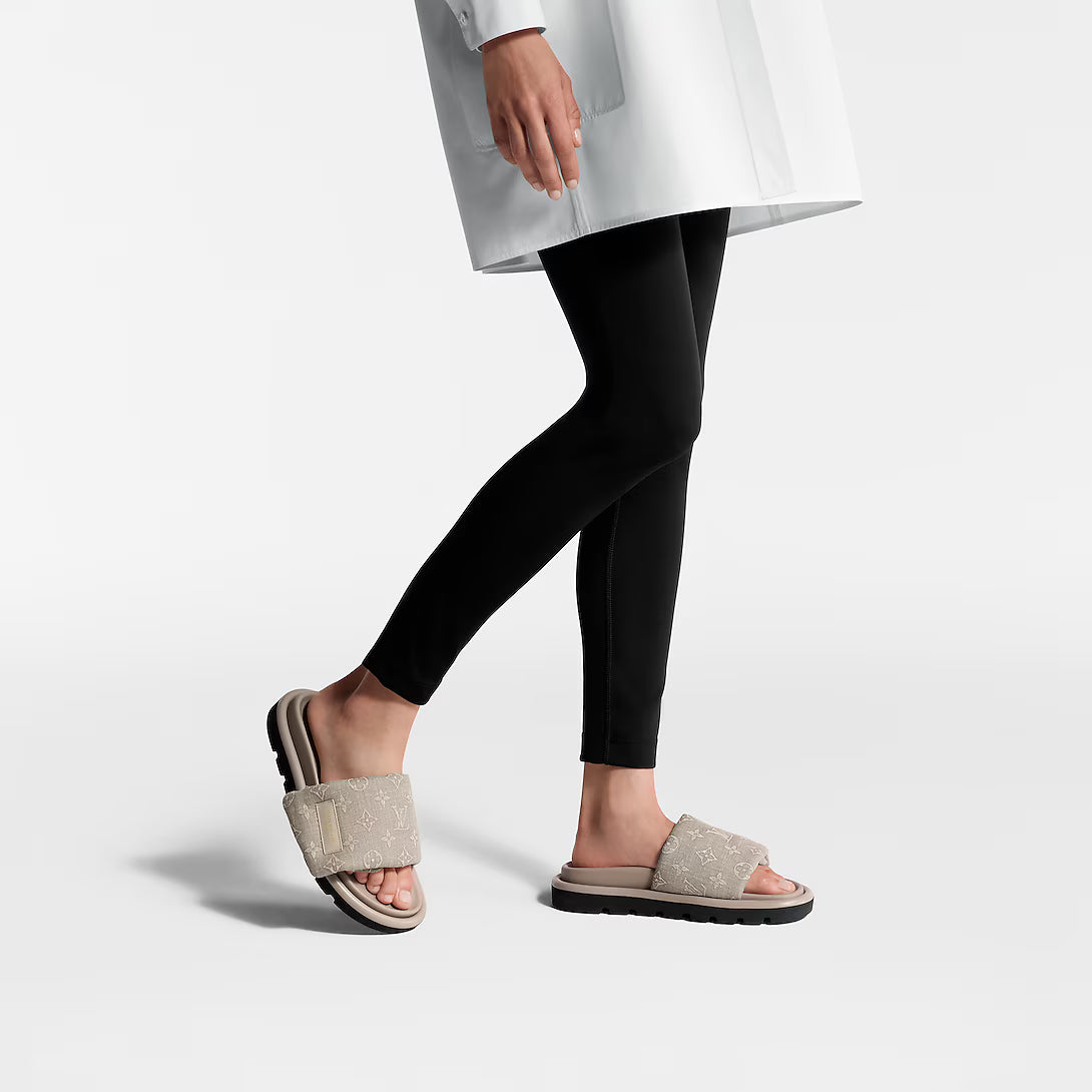 The Pool Pillow flat comfort mule is revisited in Monogram jacquard with a faded, vintage look. At once on-trend and easy to wear, this model is distinguished by its padded, pillow-like front strap, which is adjusted with velcro and signed with a Louis Vuitton-embossed leather label. A comfortable anatomic footbed and lightweight micro outsole complete this design.