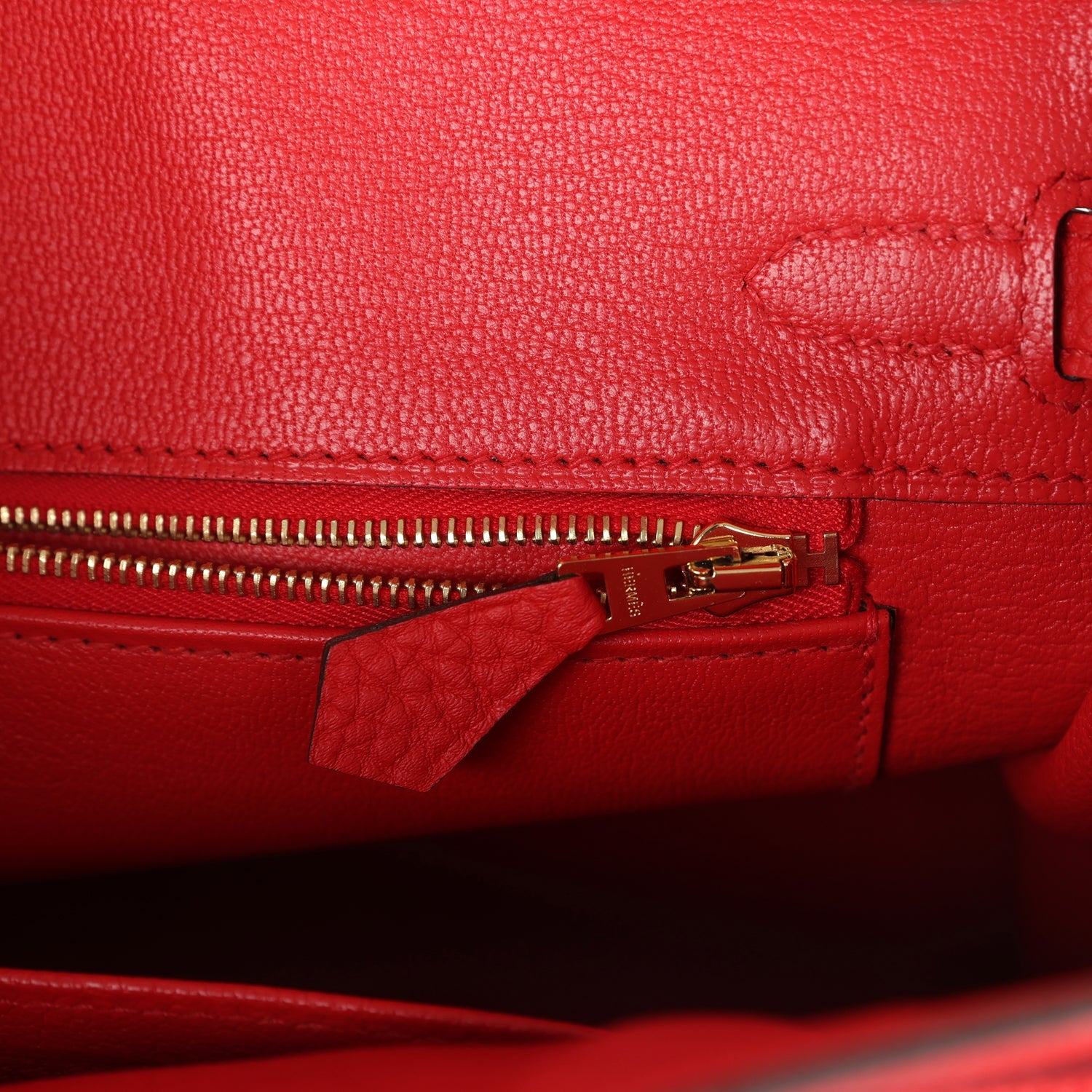 The interior is lined with Rouge De Coeur Chevre and has one zip pocket with an Hermès engraved zipper pull and an open pocket on the opposite side.