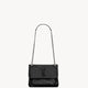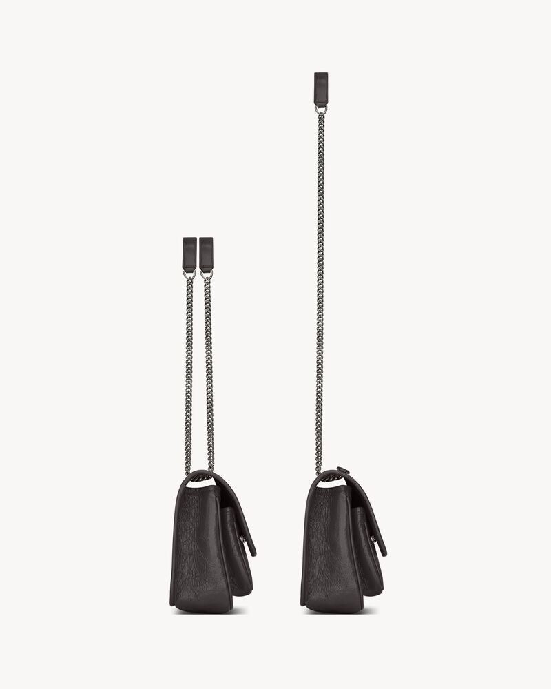 Features a sliding chain strap that can be worn on the shoulder or crossbody.