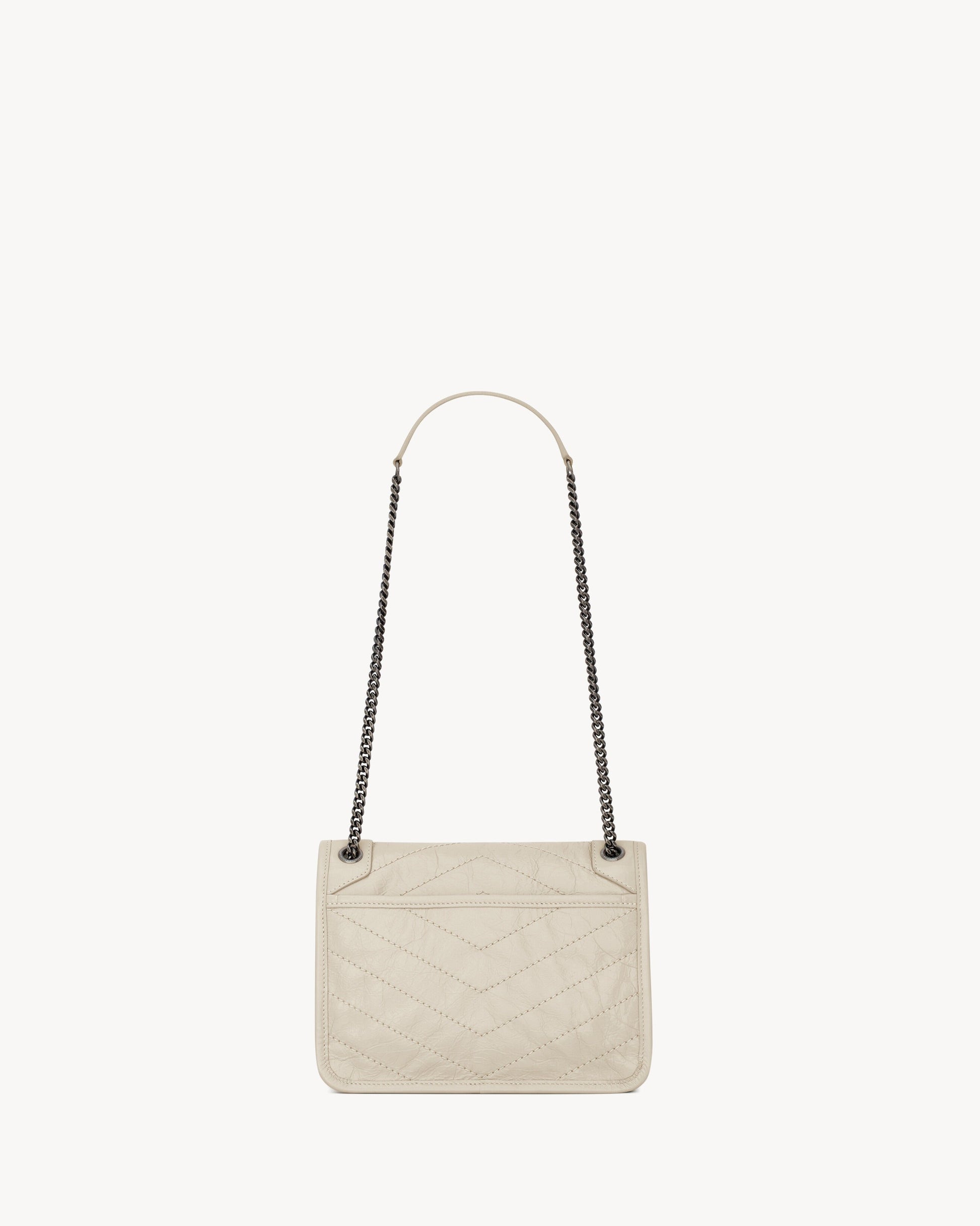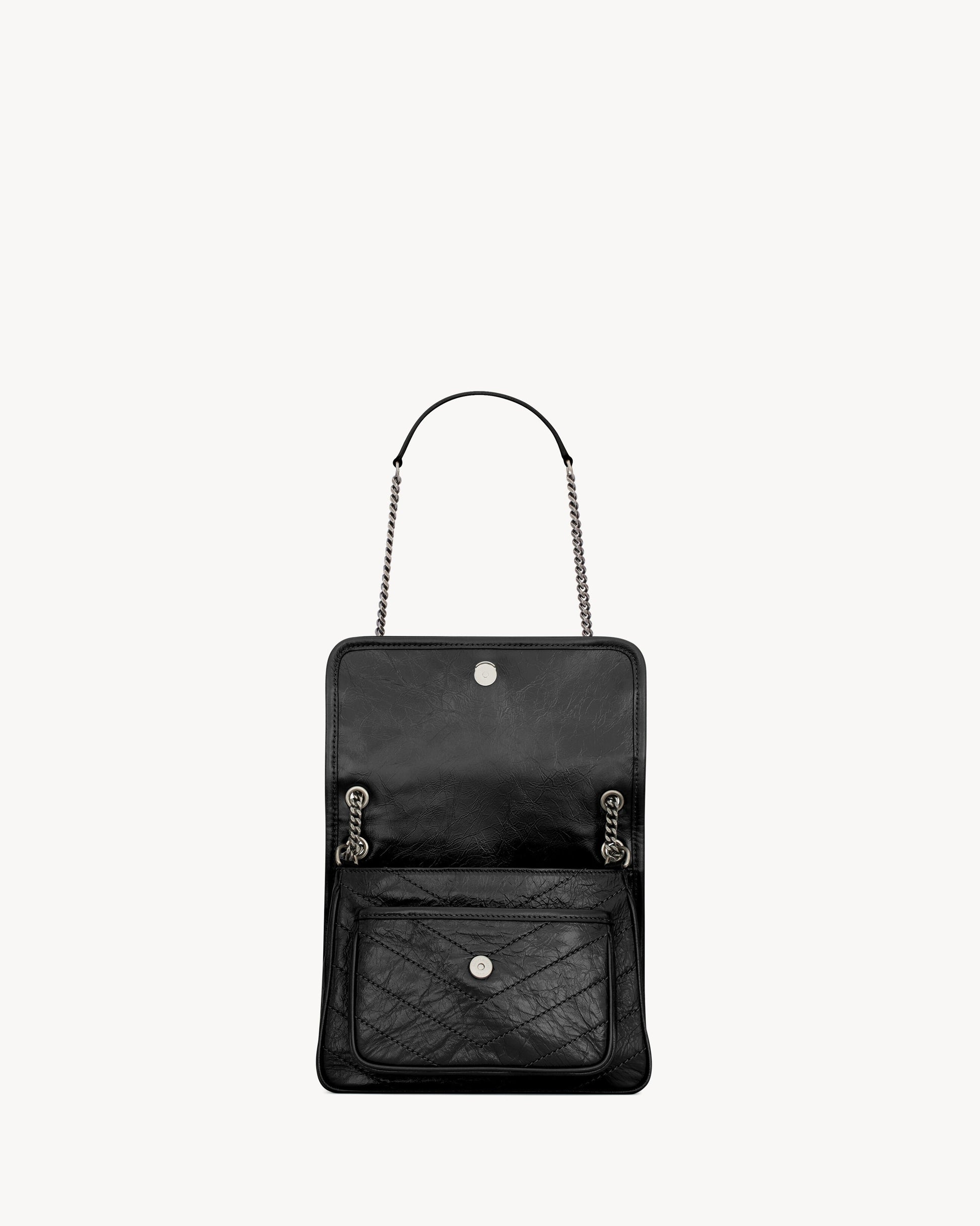 Flap bag in vintage calf leather, featuring chevron quilt overstitching and leather-encased cassandre.