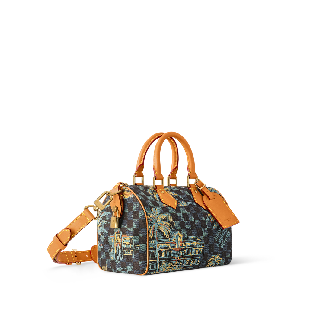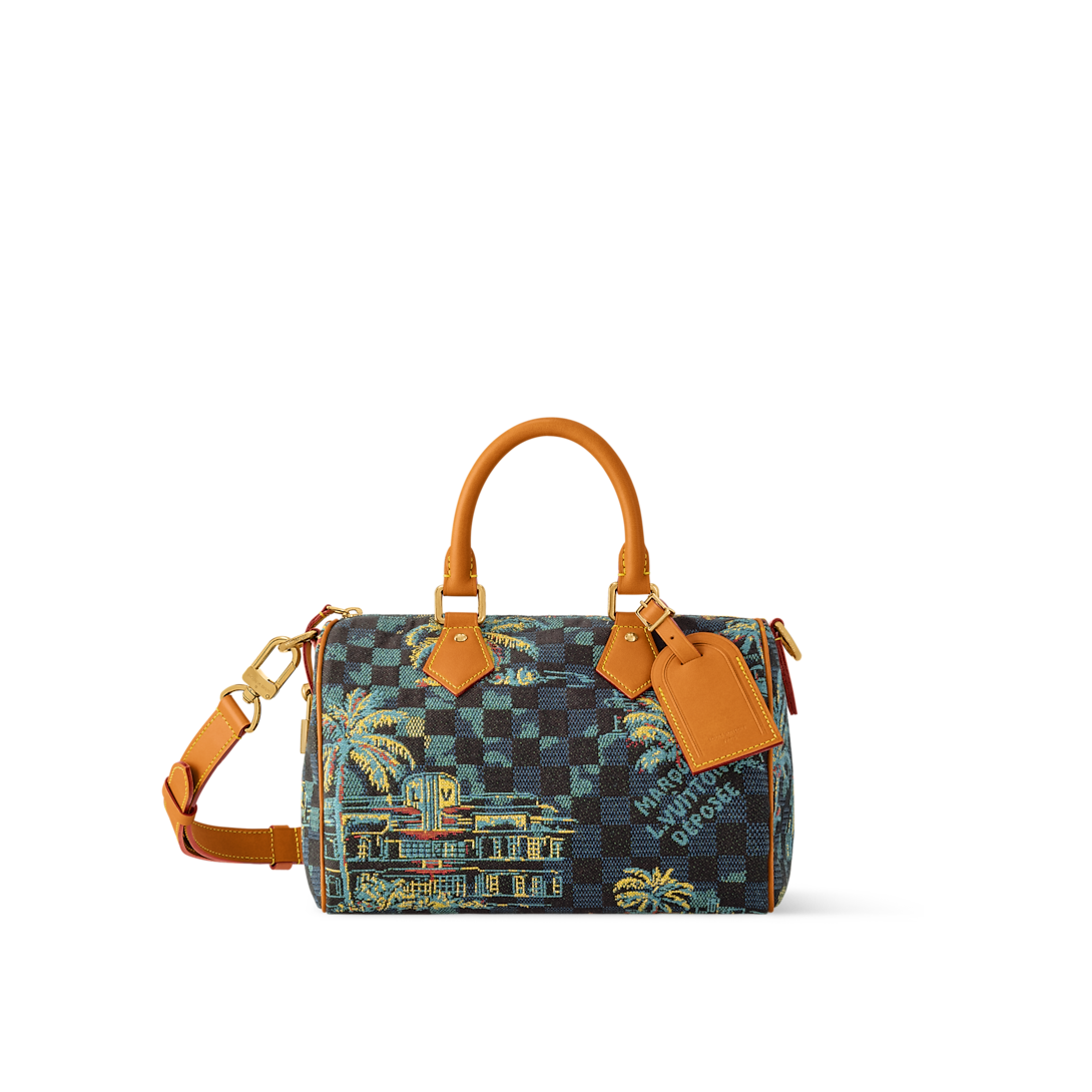 Made from jacquard cotton, the Speedy 25 Bandoulière features a woven design depicting Miami and its vibrant nightlife on a Damier checkerboard background. Palm trees and Art Deco buildings add a beachy feel to the Speedy’s emblematic lines. Golden hardware and leather trim complete the design. Top handles and a removable, adjustable strap provide carrying options.