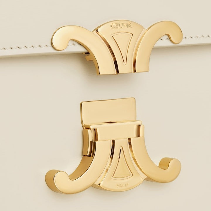 The gold-finished hardware, a signature of the Celine style, signals its personality. The clasp - a reinterpretation of the Maison’s iconic 1970s logo - integrates a mechanism developed like a piece of jewellery, built symmetrically in two parts.