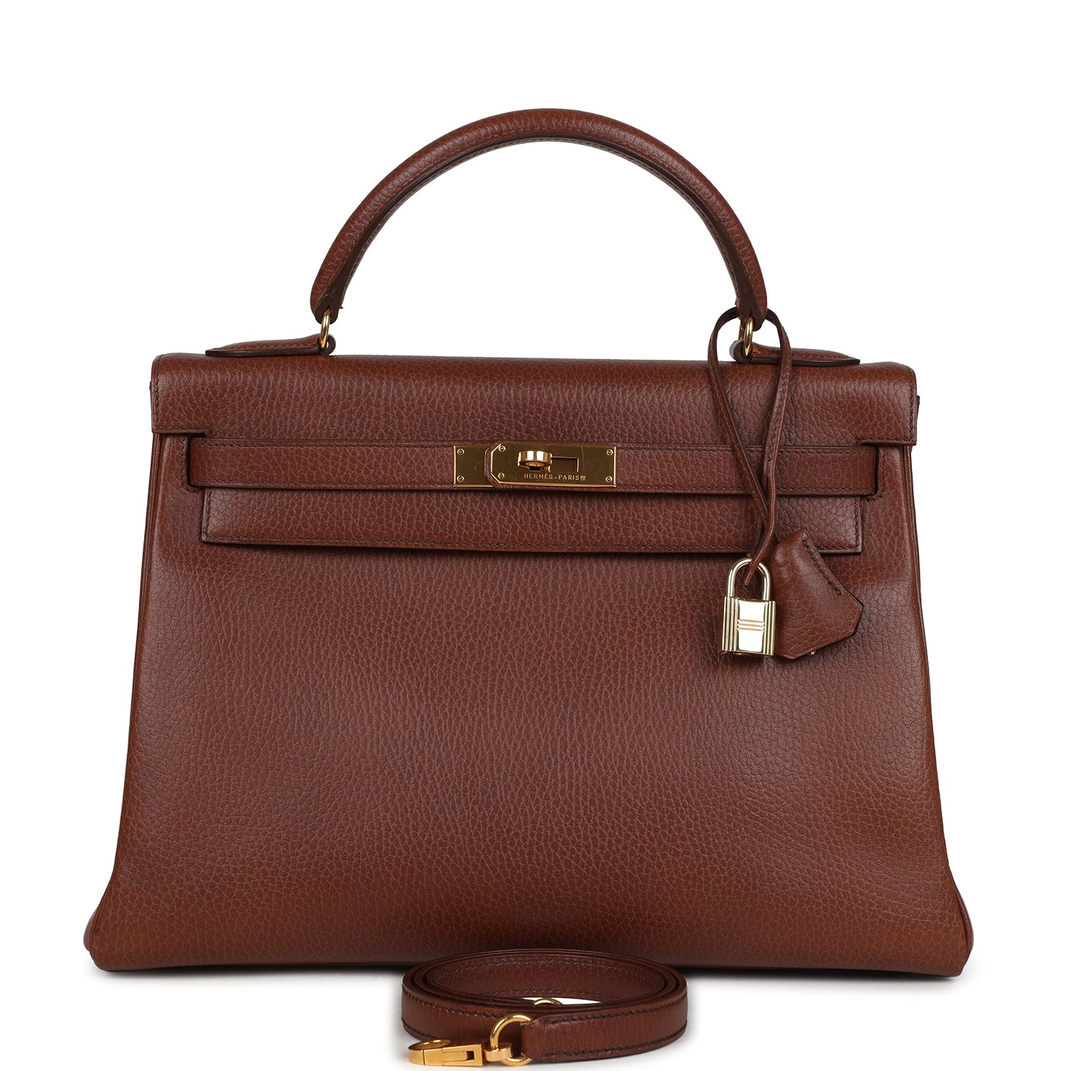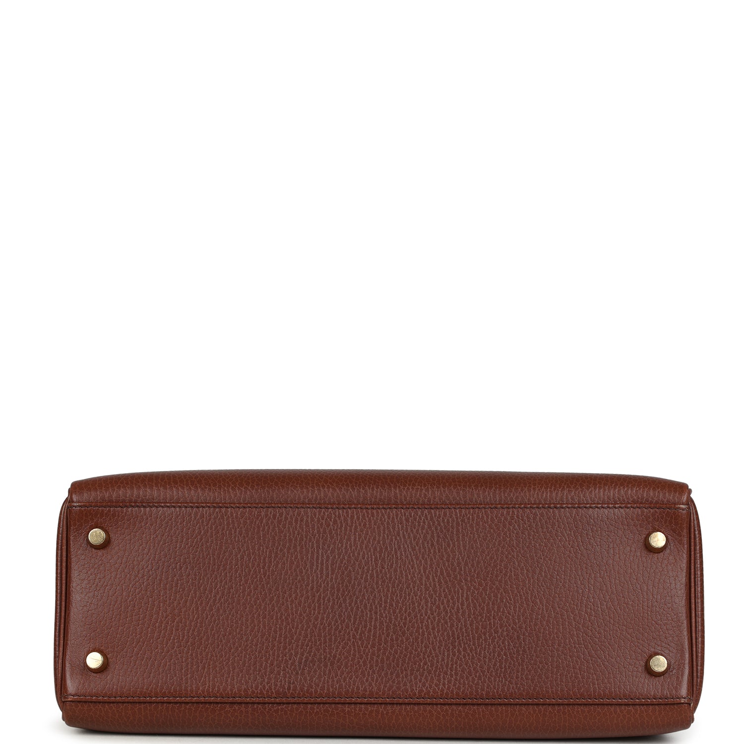This vintage Kelly, in the Retourne style, is of Marron Fonce Ardennes leather with gold hardware and has tonal stitching, a front toggle closure, a clochette with lock and two keys and a single rolled handle and a removable shoulder strap.