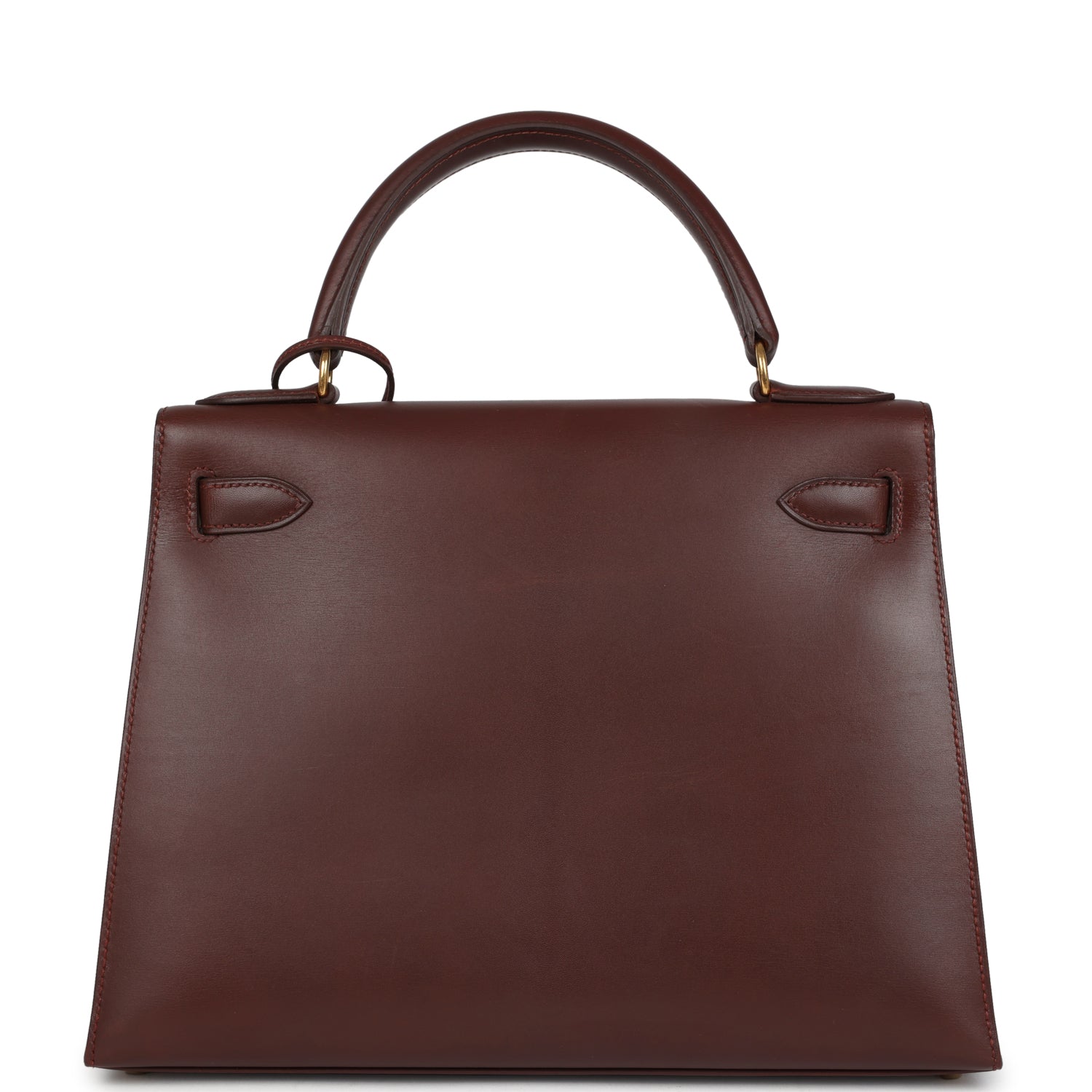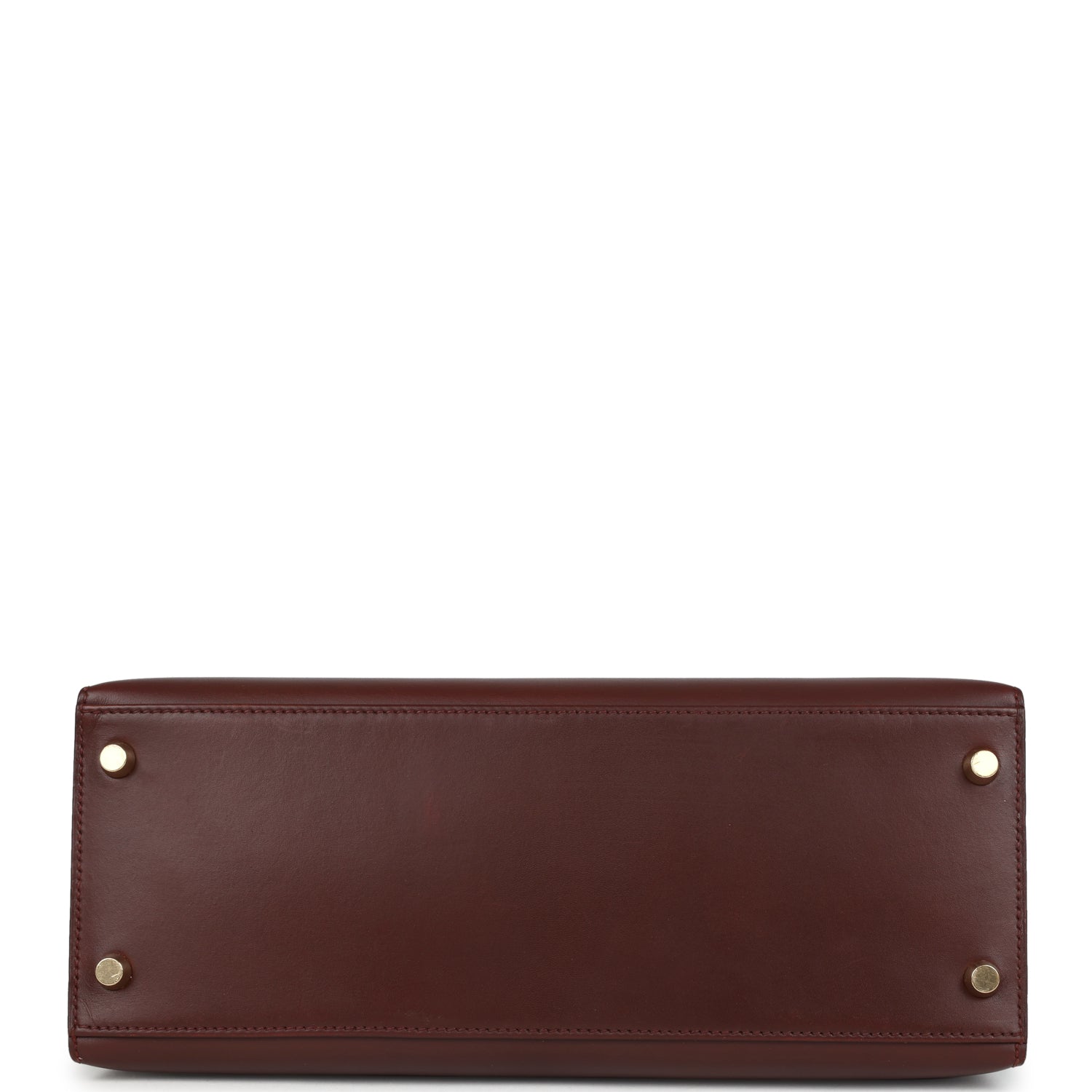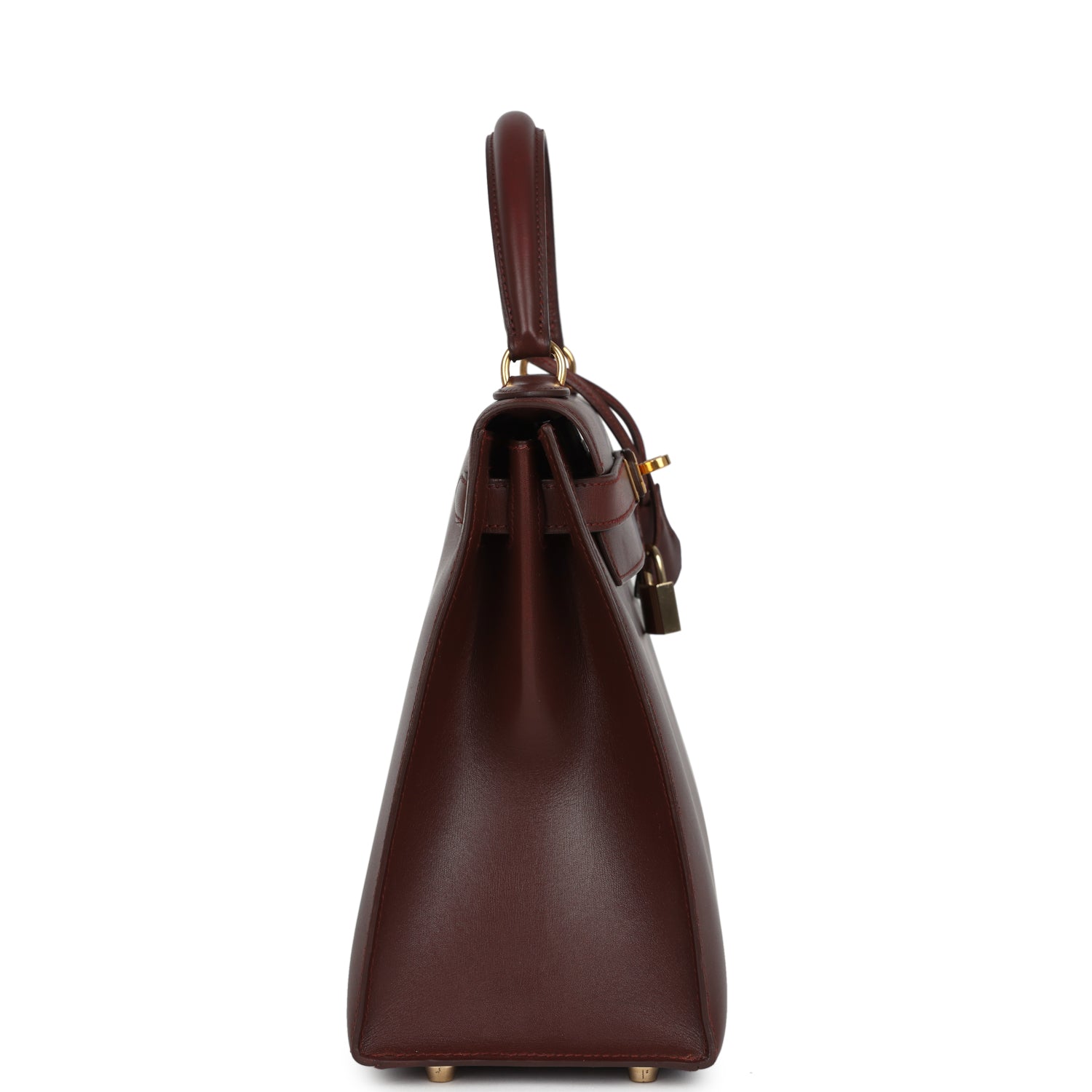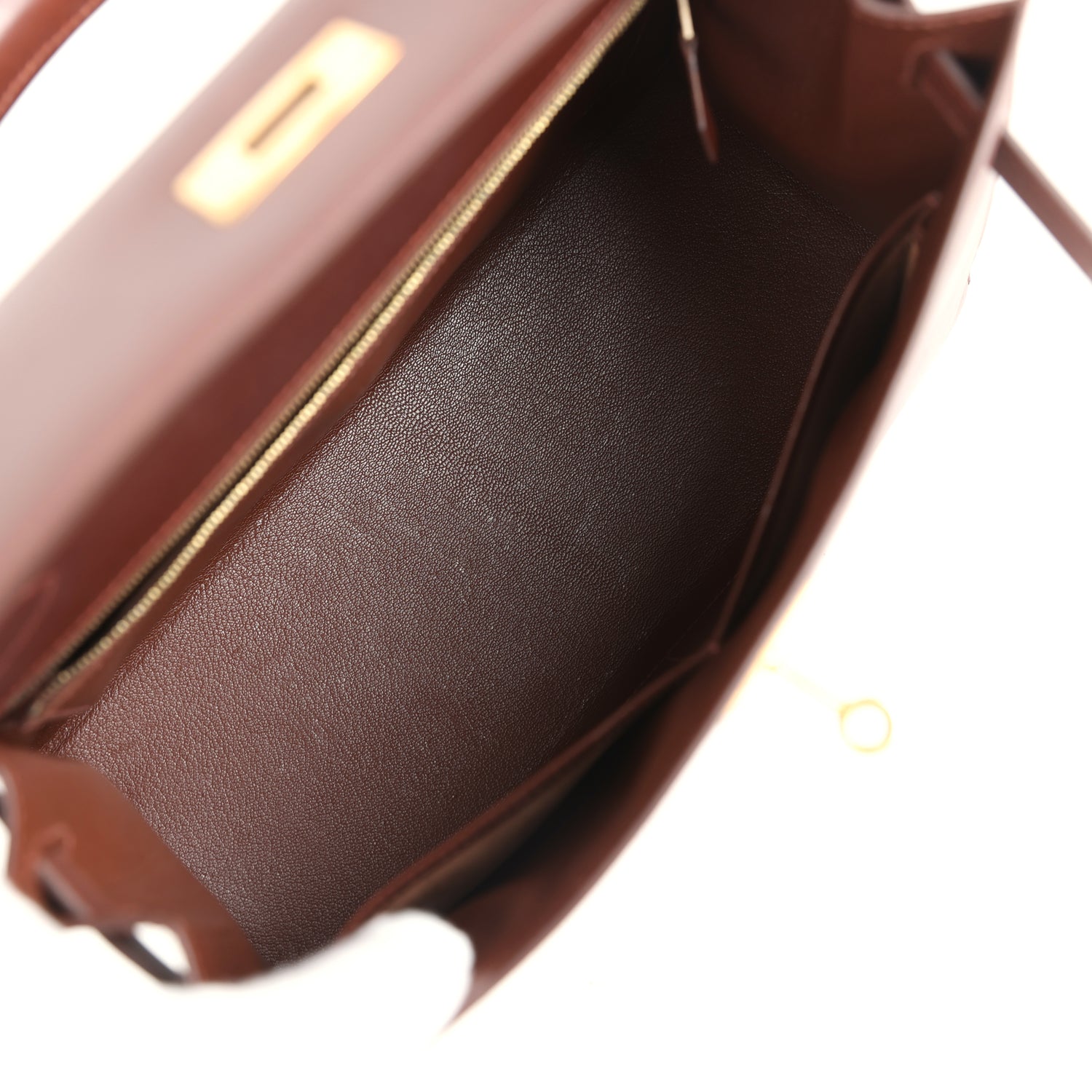 This Kelly, in the Sellier style, is of Noisette Box calfskin leather with gold hardware and has tonal stitching, two straps with front toggle closure, clochette, lock and one key, single rolled handle and removable shoulder strap.