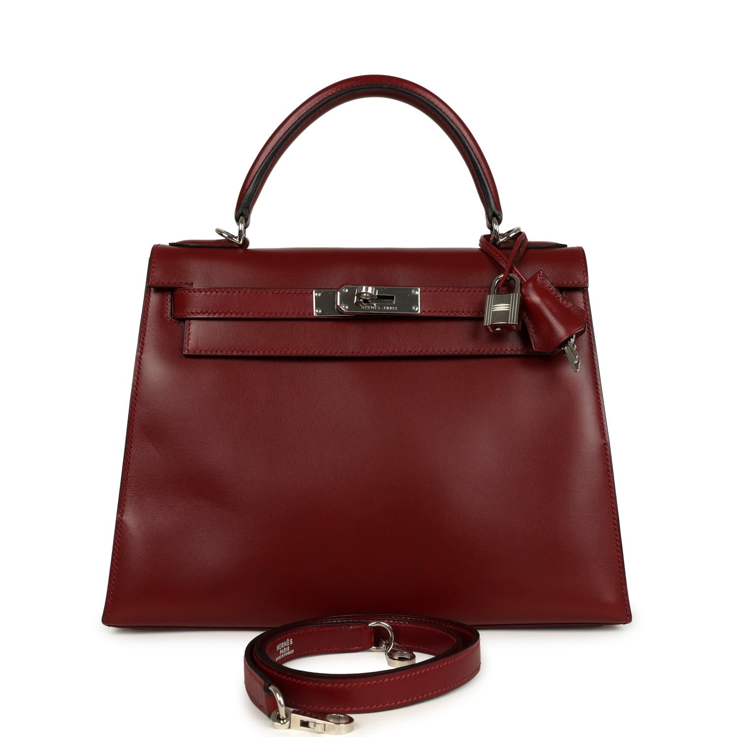 This vintage Kelly, in the Sellier style, is in Rouge H Box calfskin leather with palladium hardware and has tonal stitching, two front straps with front toggle closure, single rolled handle and removable shoulder strap.
