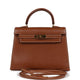 This Kelly, in the Sellier style, is in Gold Courchevel leather with gold hardware and has contrast stitching, two straps with front toggle closure, single rolled handle and removable shoulder strap.