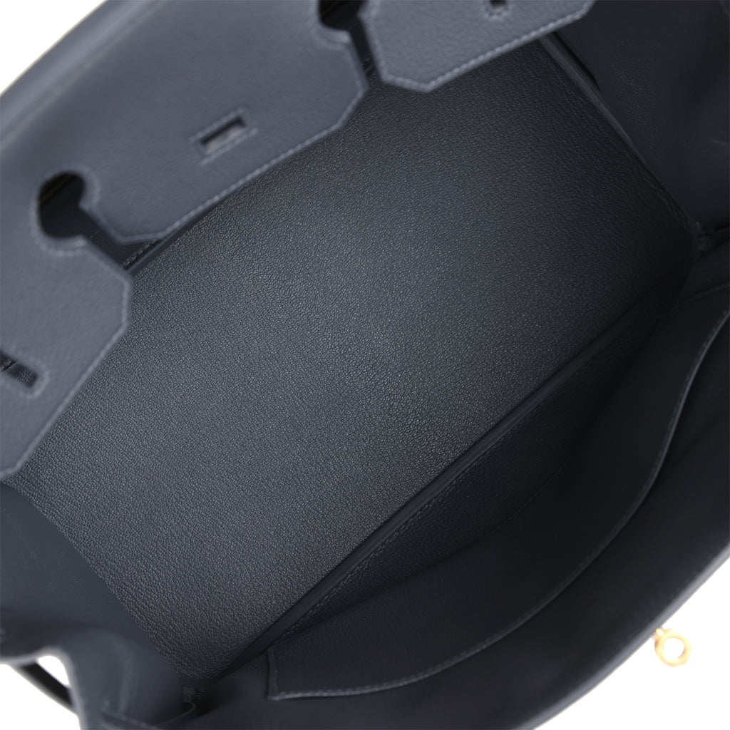 This Birkin is in Ardoise togo leather with gold hardware and has tonal stitching, front flap, two straps with center toggle closure, clochette with lock and two keys, and double rolled handles.