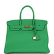 This Birkin is in Bambou togo leather with gold hardware and has tonal stitching, front flap, two straps with center toggle closure, clochette with lock and two keys, and double rolled handles.
