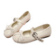 Creamy ballerina from elegant and flat shiny leather with a ribbon decorated with metal rings and a decorated with a fonka.