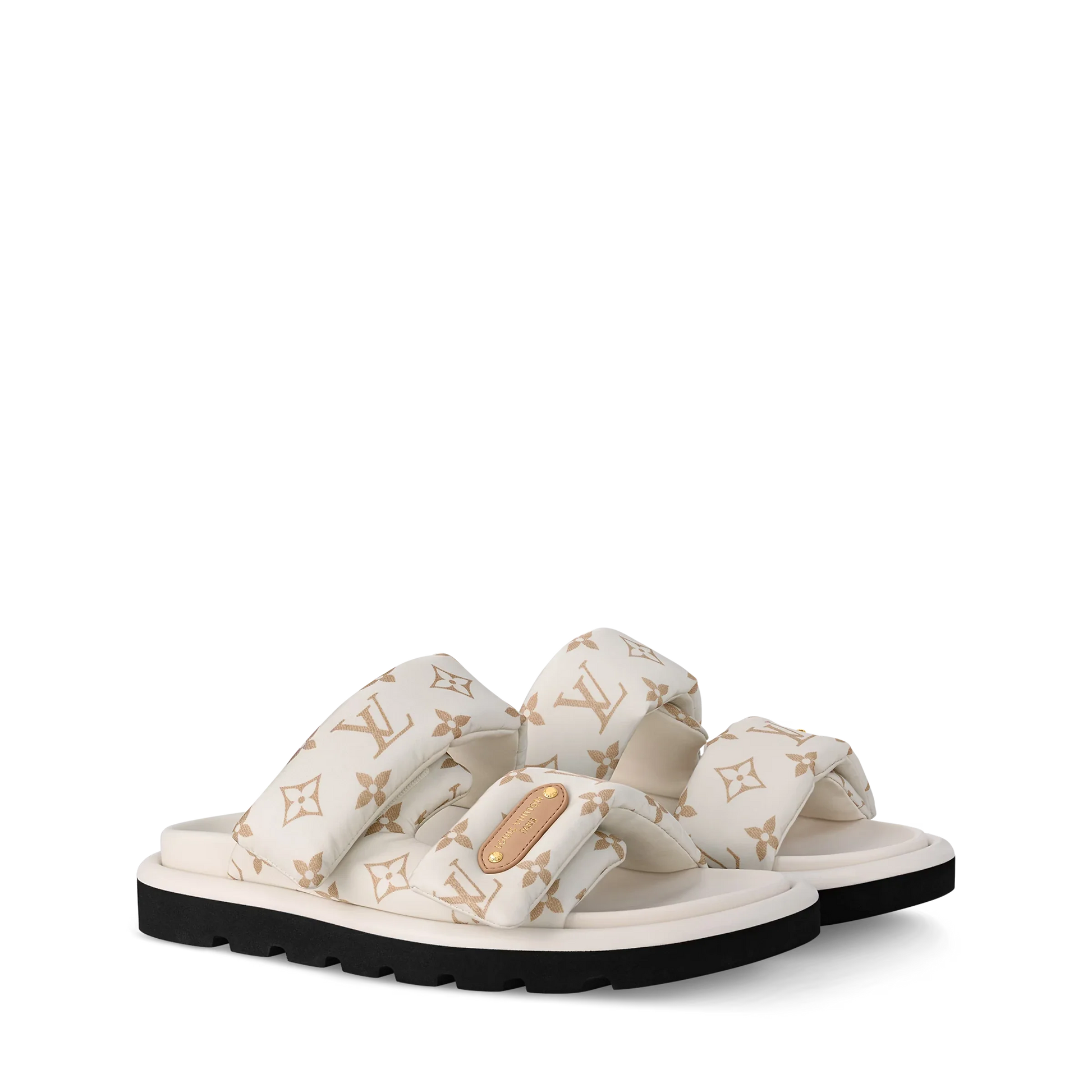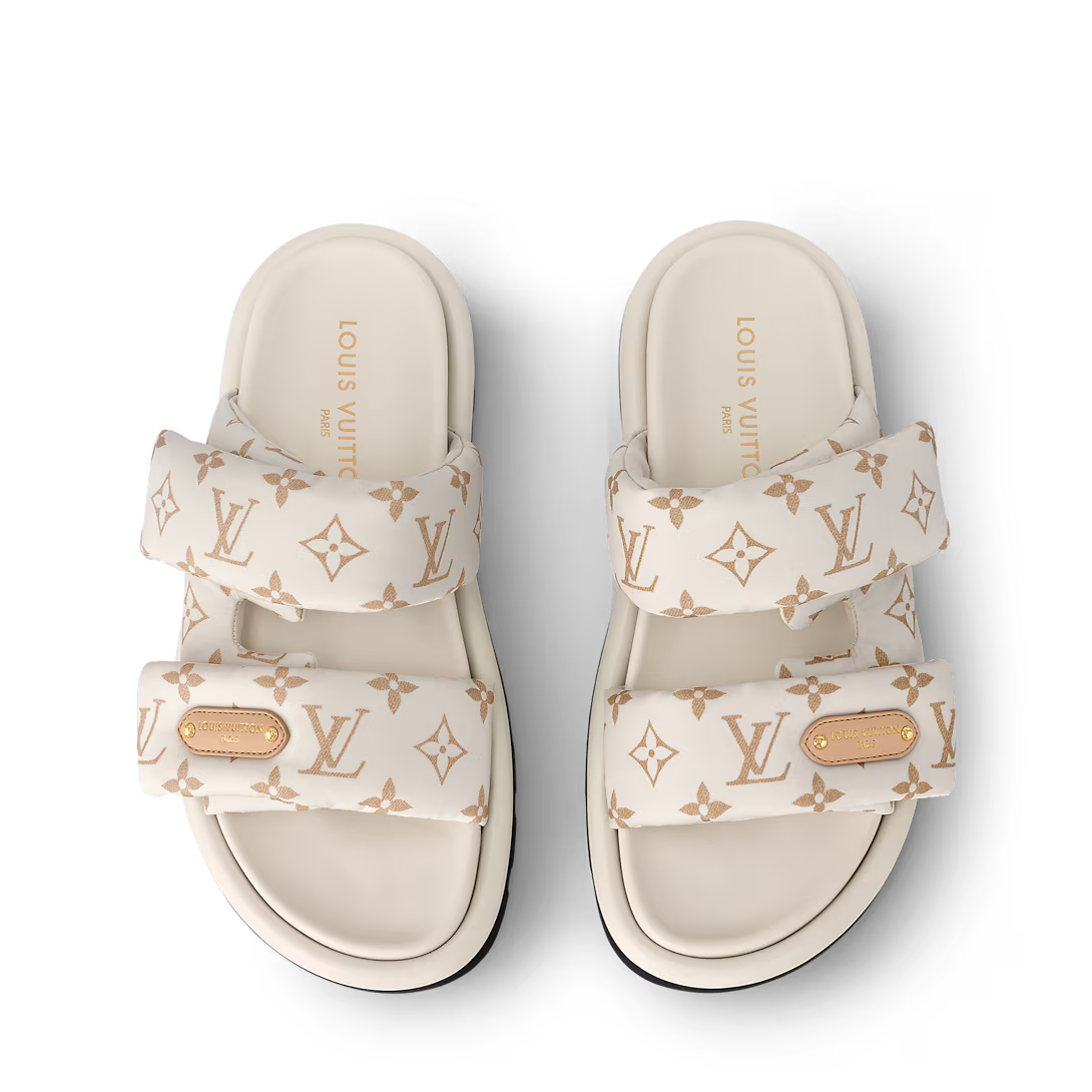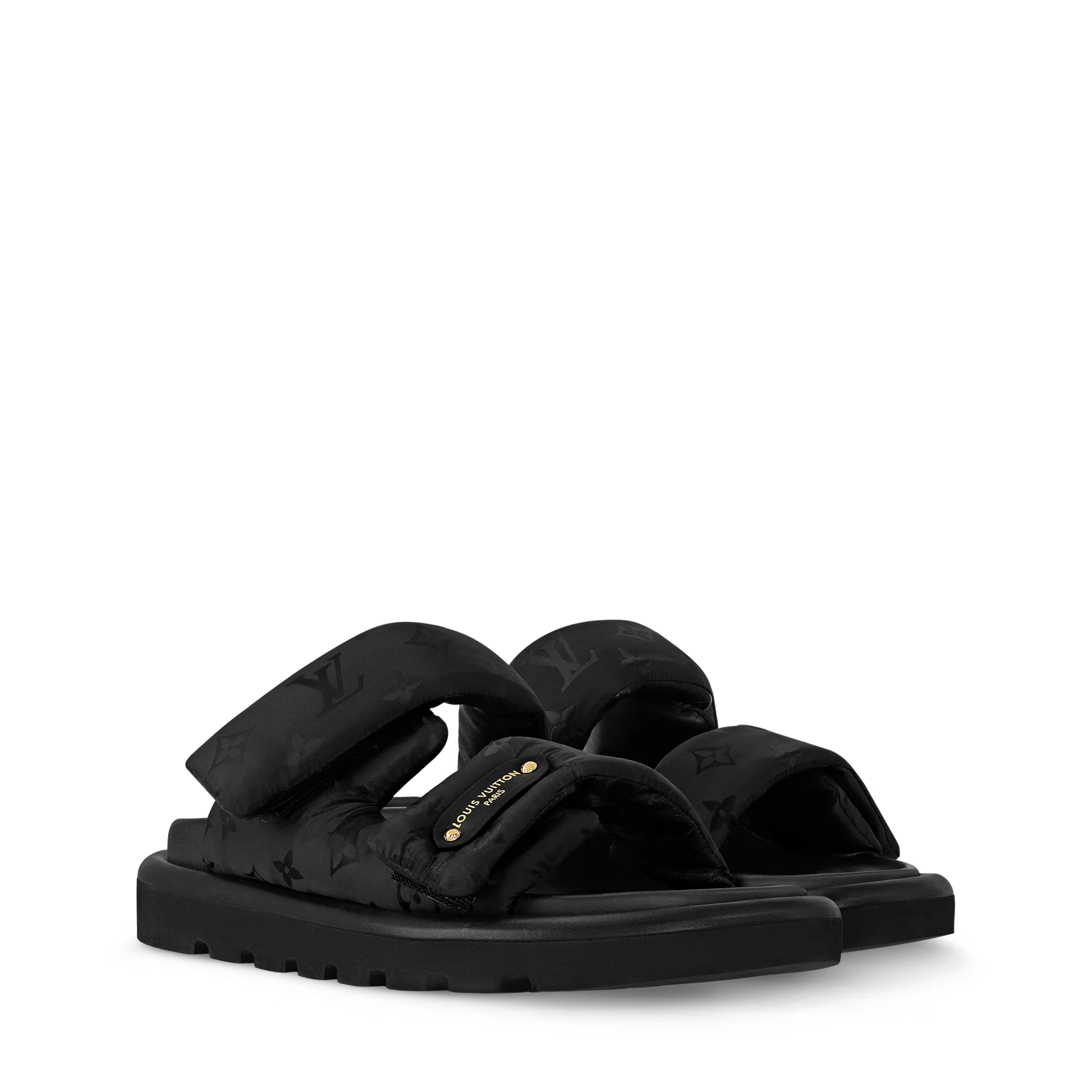 The Pool Pillow comfort mule is revisited with two padded, adjustable straps in Monogram nylon, which are lined with leather for comfort and durability. The front strap is embellished with a leather label embossed with the Louis Vuitton signature. This easy-to-wear style is finished with a comfortable anatomic footbed and a lightweight micro outsole.