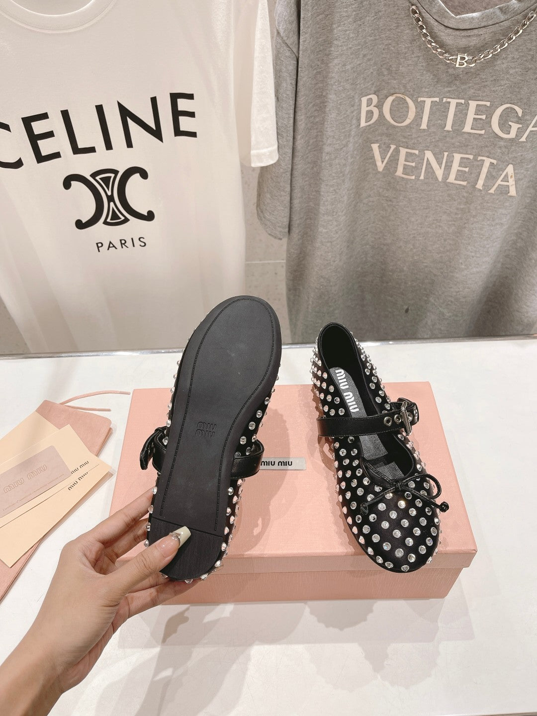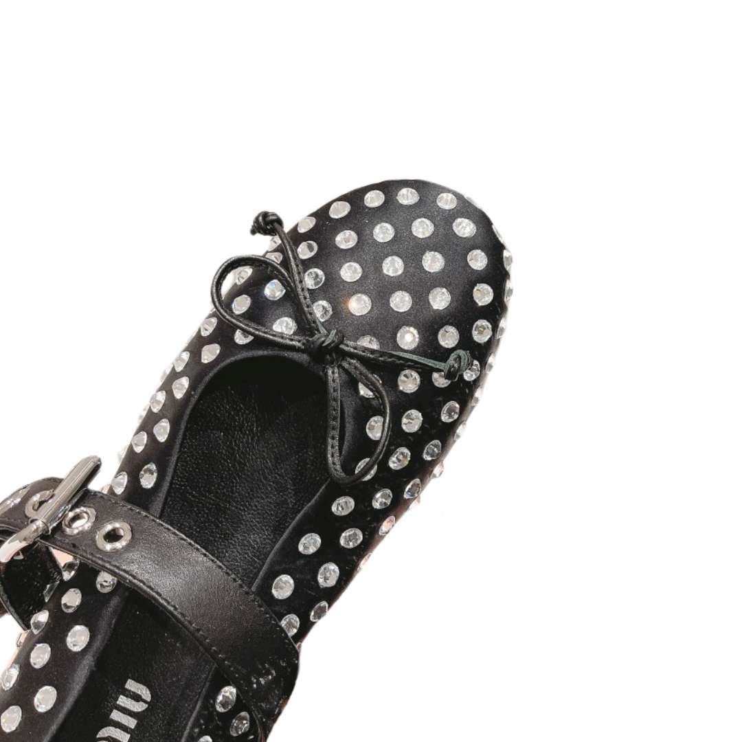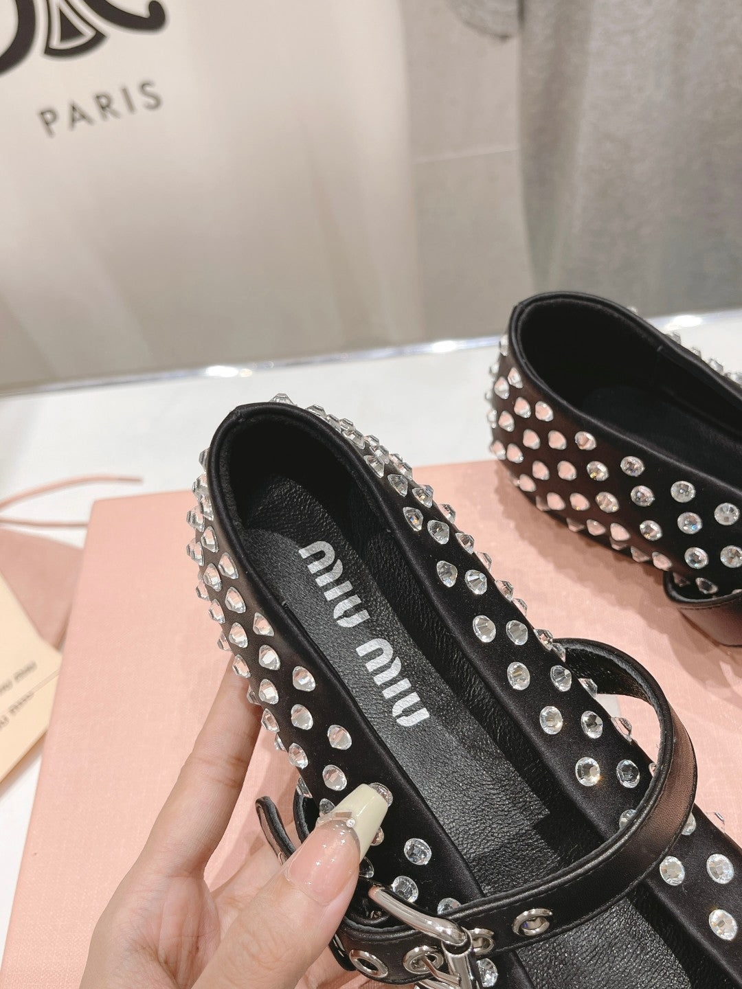 Keep up with the ballerina shoes in bold style with this Miu Miu shoe. Comes made of crystal-encrused satin with a metal buckle strap on the top.