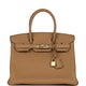This Birkin is in Biscuit togo leather with gold Hardware, tonal stitching, front flap with two straps, front toggle closure, clochette with lock and two keys, and double rolled handles