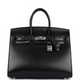 This Birkin is in Black box calf leather with palladium hardware and has tonal stitching, front flap, two straps with center toggle closure, clochette with lock and two keys, and double rolled handles.