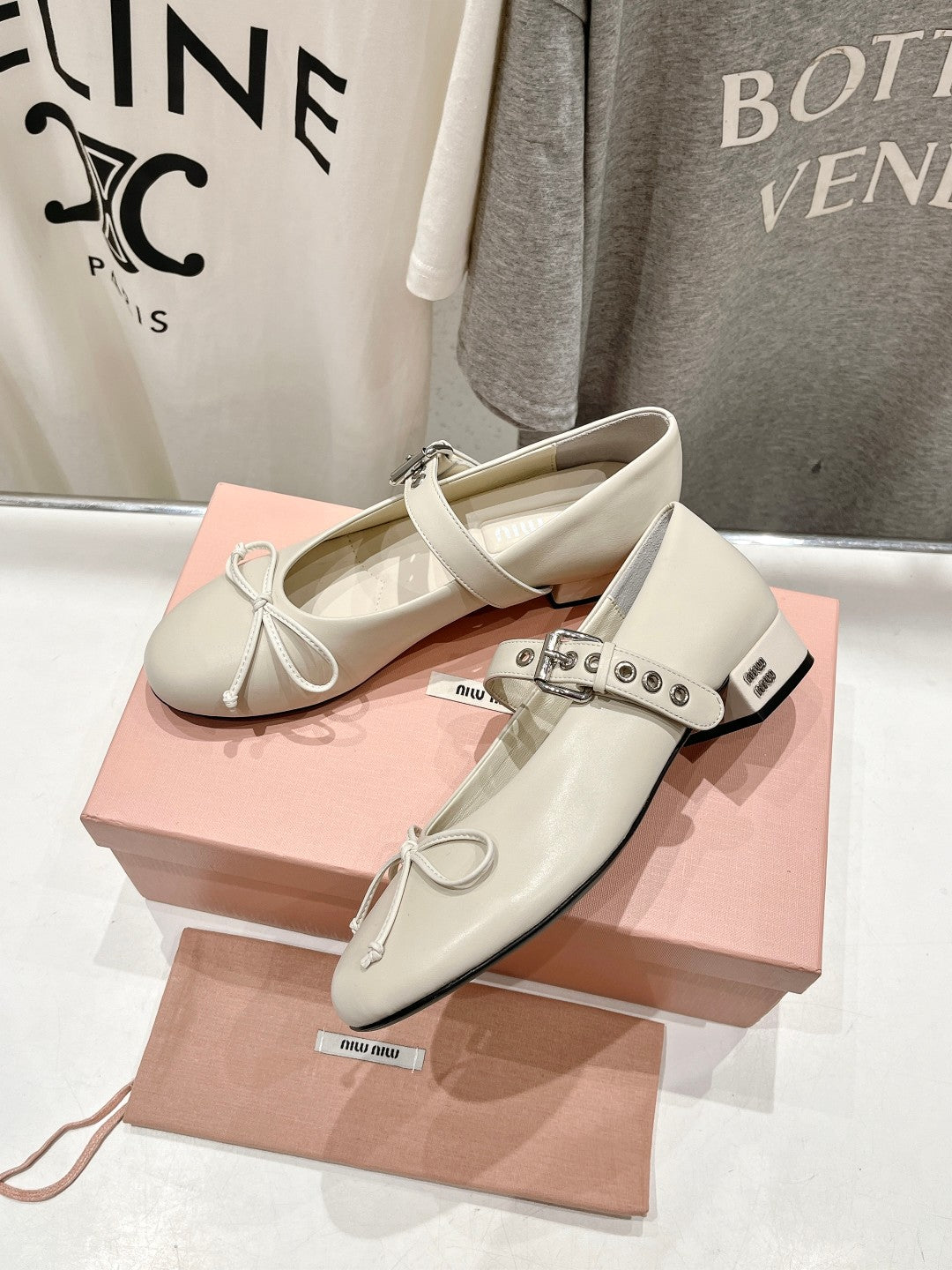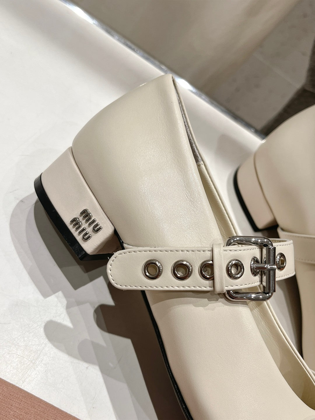Women's Miu Miu women's shoes in Creamy, made of leather, featuring a metal buckle top, and a small fione at the front of the foot.