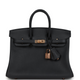 This Birkin is in Black swift leather with rose gold hardware and has tonal stitching, two straps with front toggle closure, clochette with lock and two keys and double rolled handles.