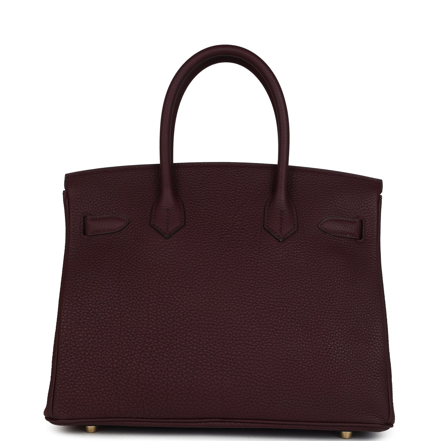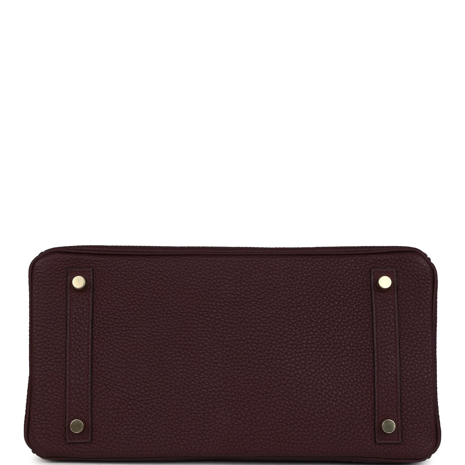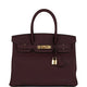 This Birkin is in Bordeaux togo leather with gold hardware and has tonal stitching, two straps with front toggle closure, clochette with lock and two keys and double rolled handles.