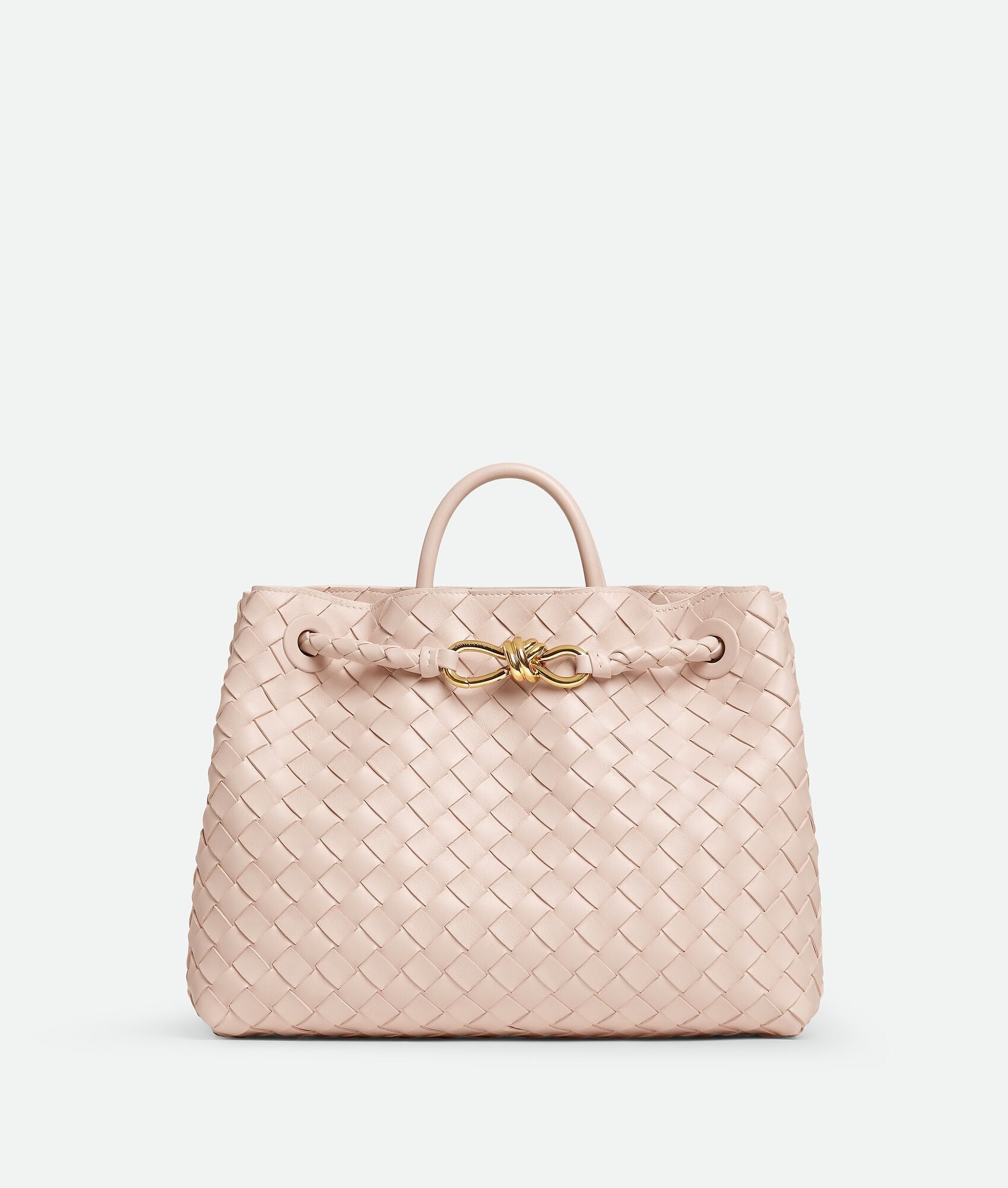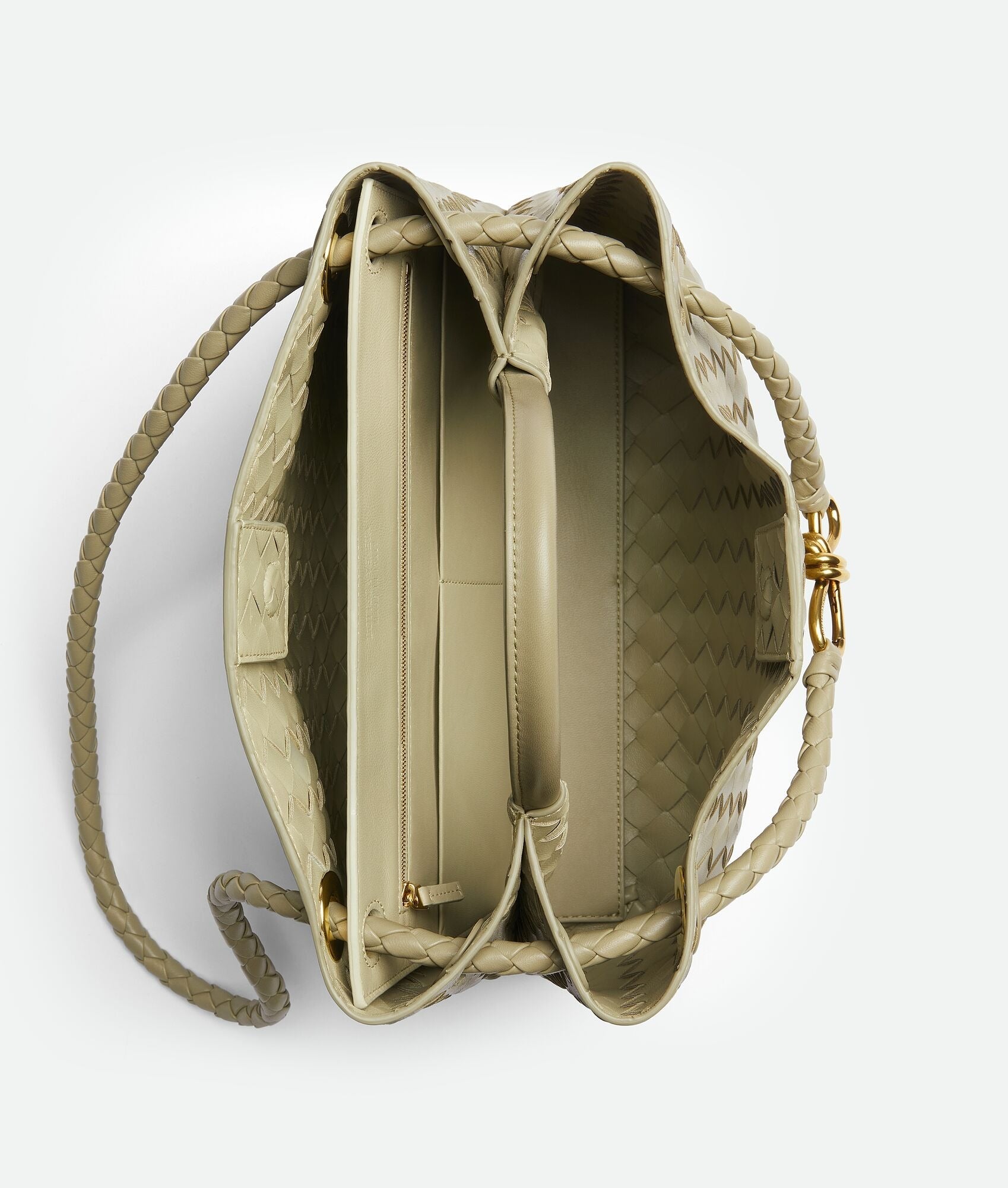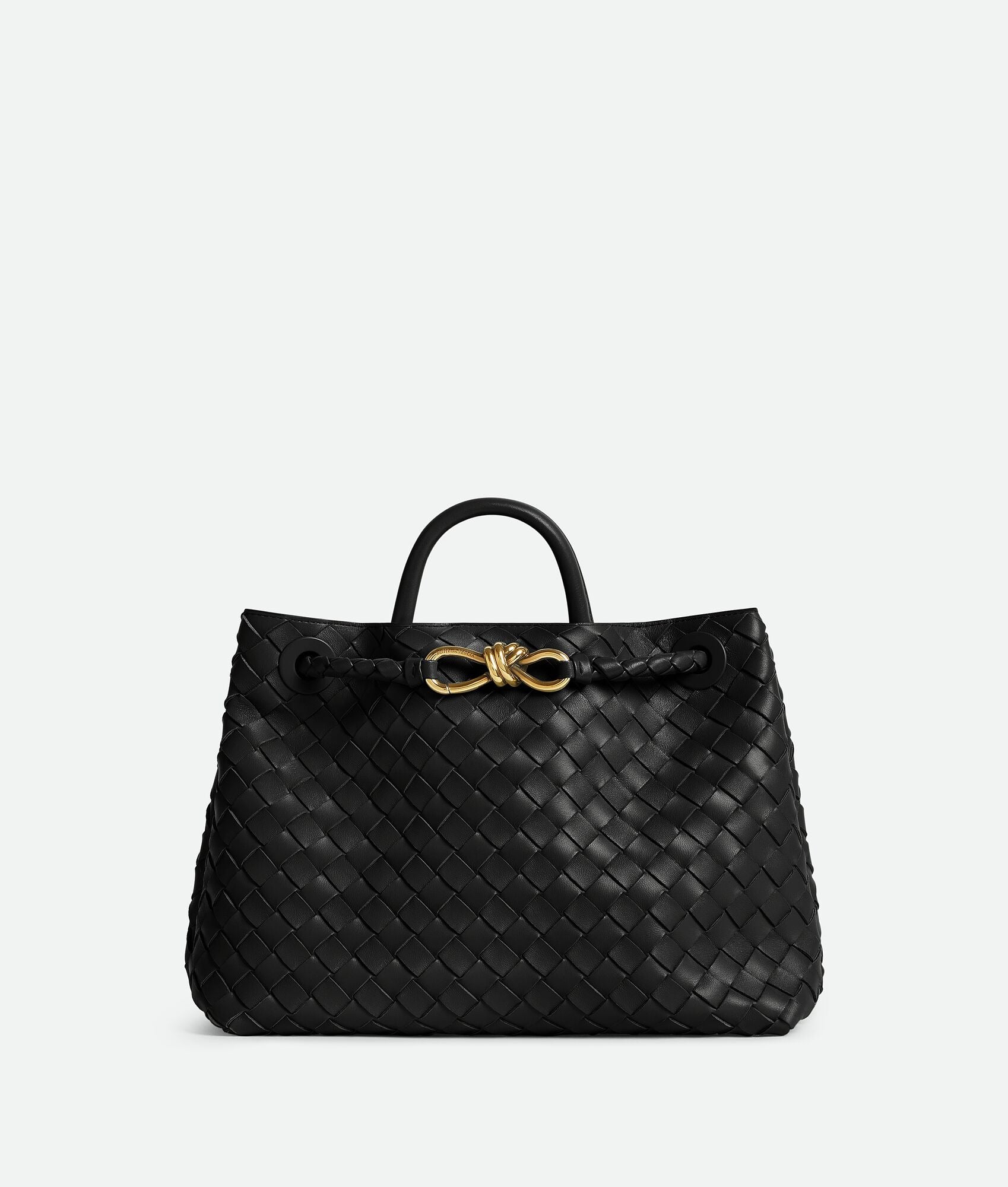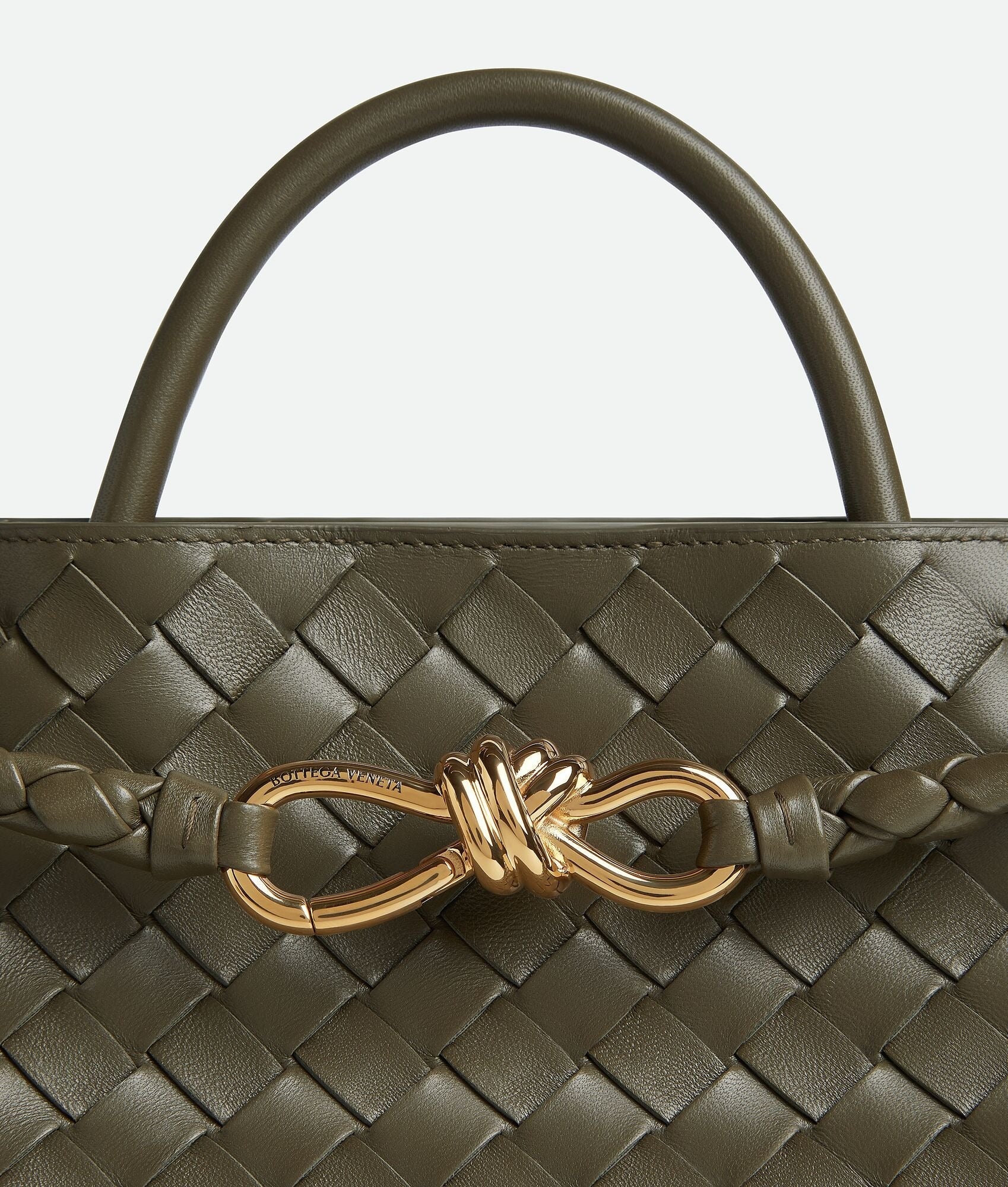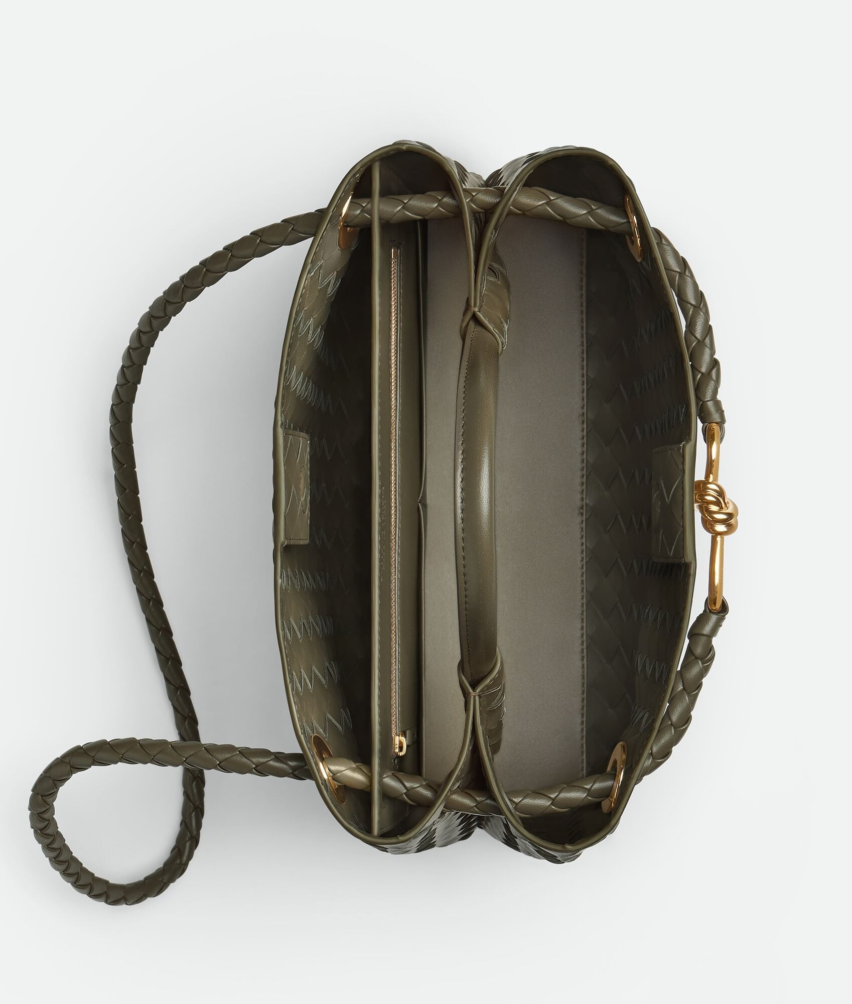Top handle bag in supple Intrecciato leather with signature knot detail and sliding cross-body strap.