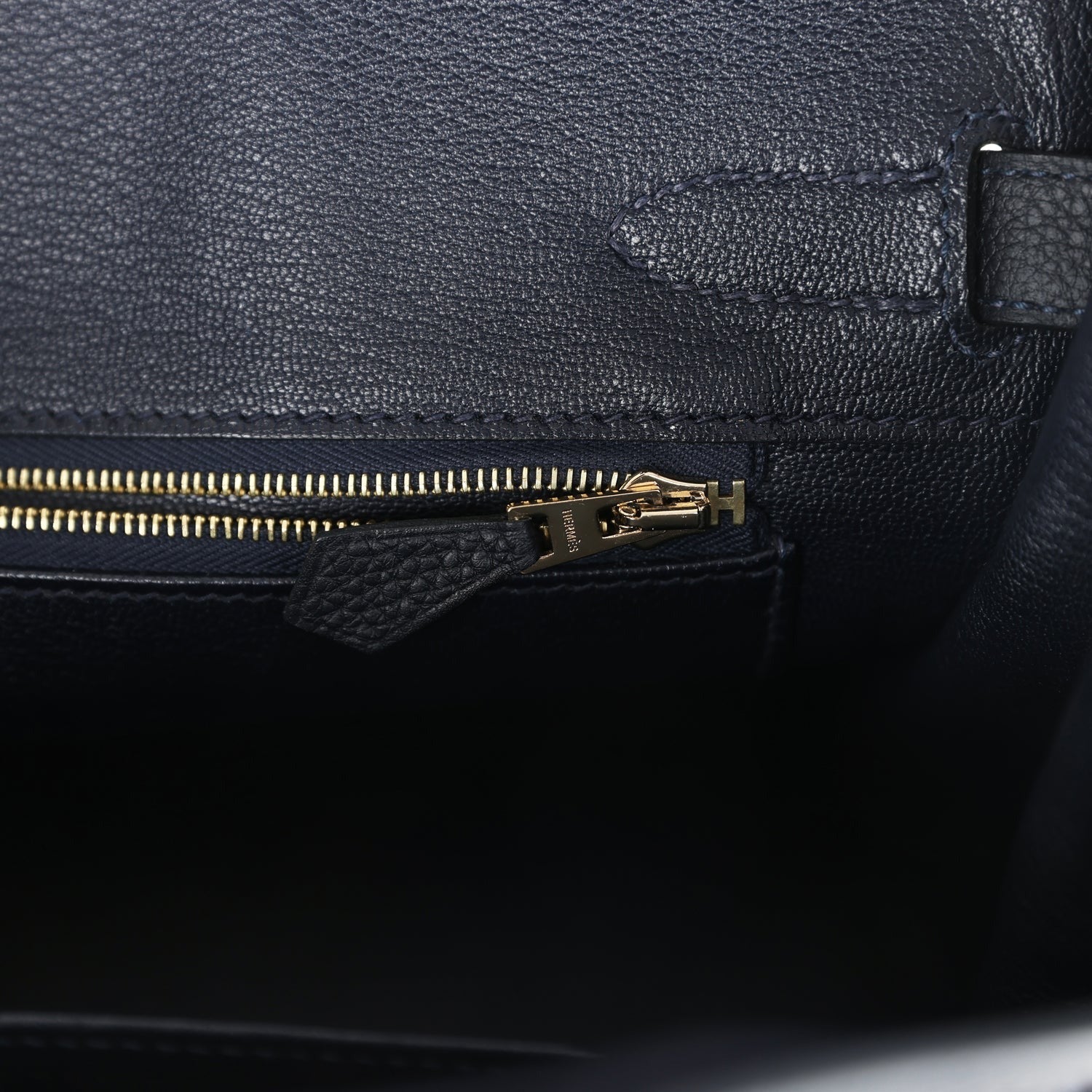 The interior is lined with Caban chevre and has one zip pocket with an Hermès engraved zipper pull and an open pocket on the opposite side.