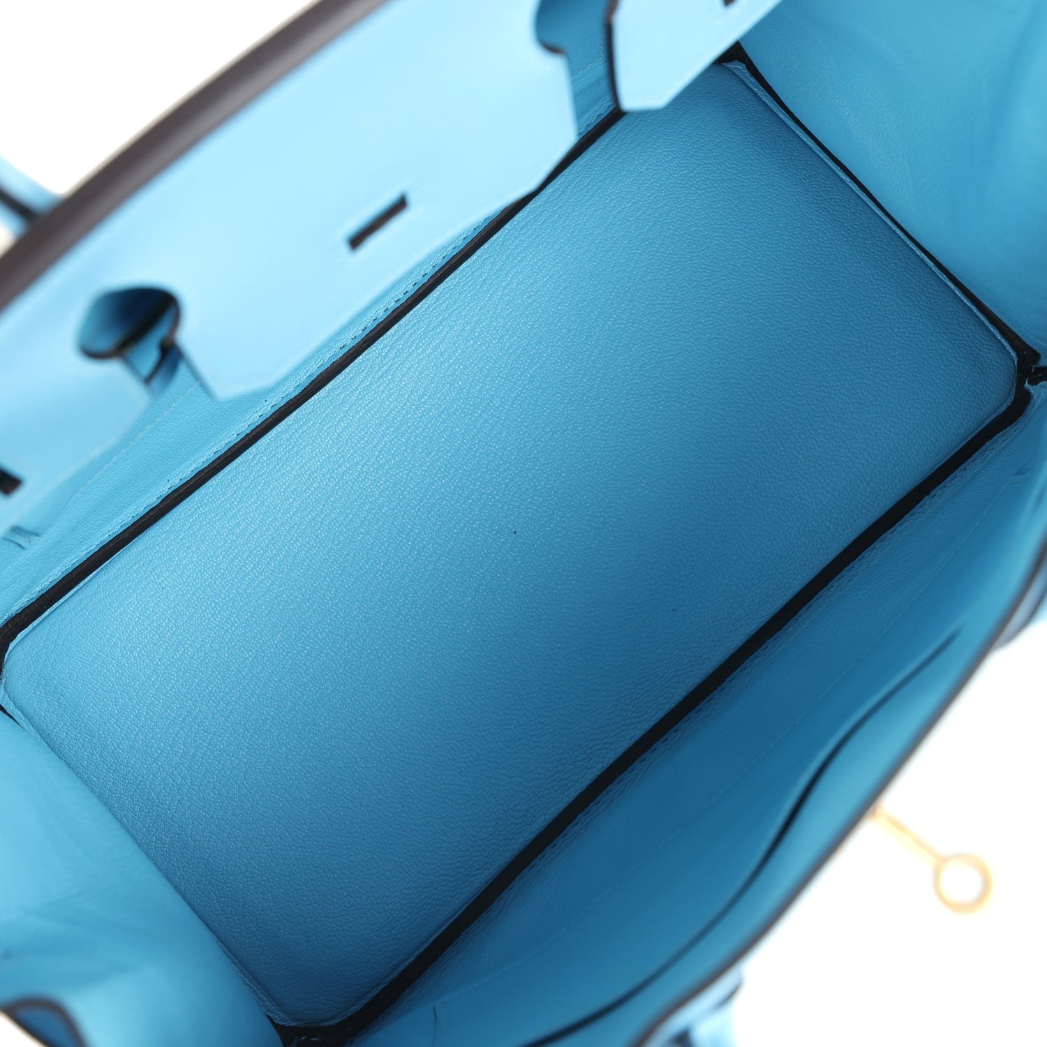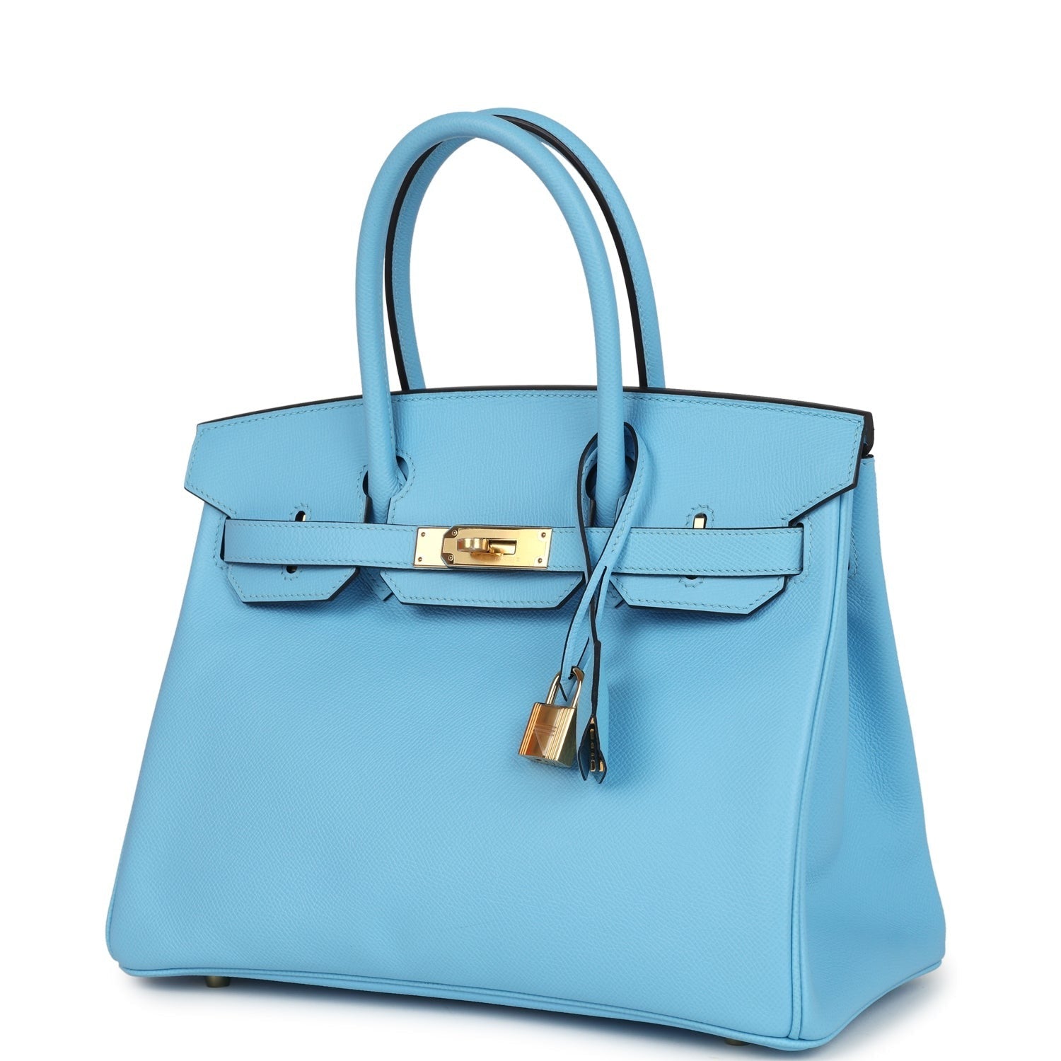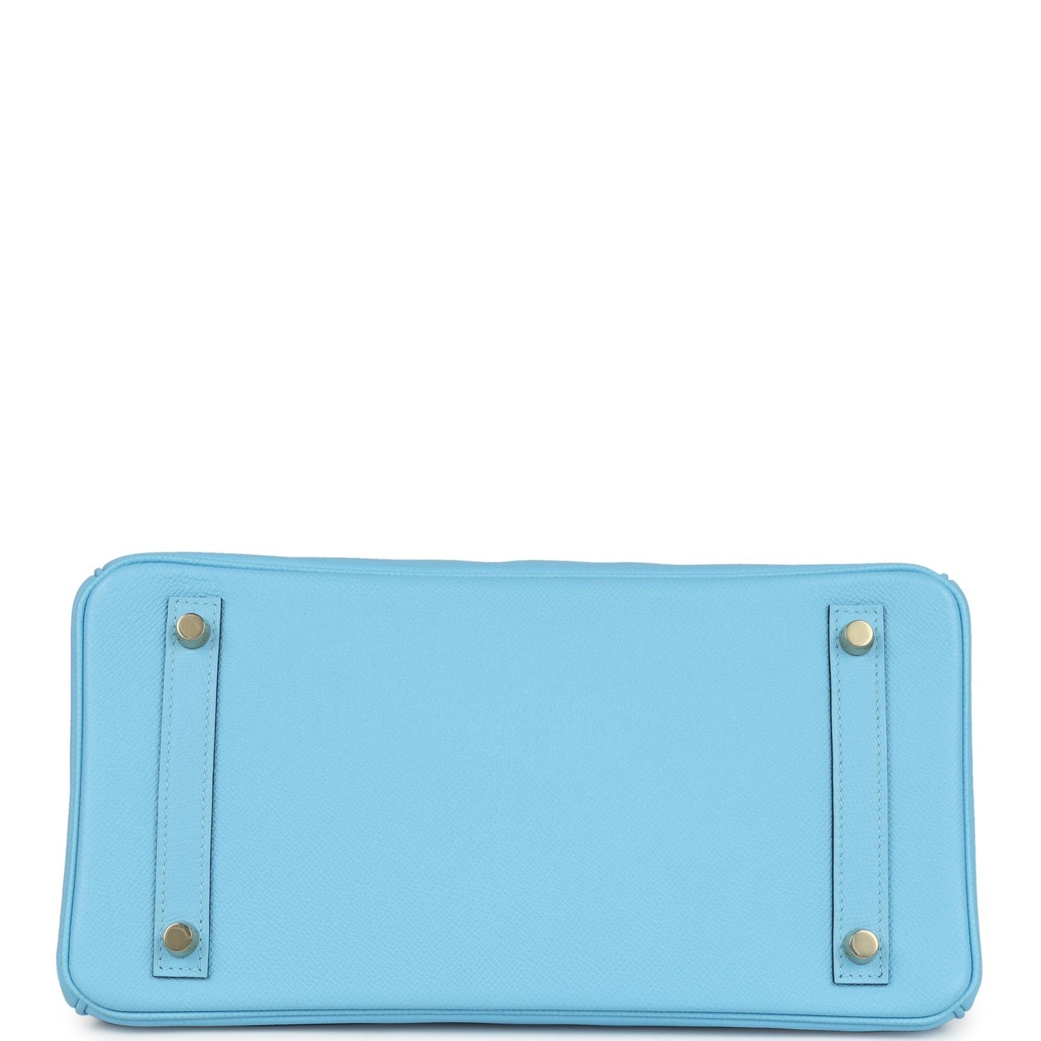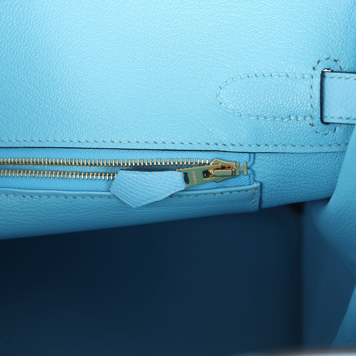 This Birkin is in Celeste epsom leather with gold hardware and has tonal stitching, front flap, two straps with center toggle closure, clochette with lock and two keys, and double rolled handles.